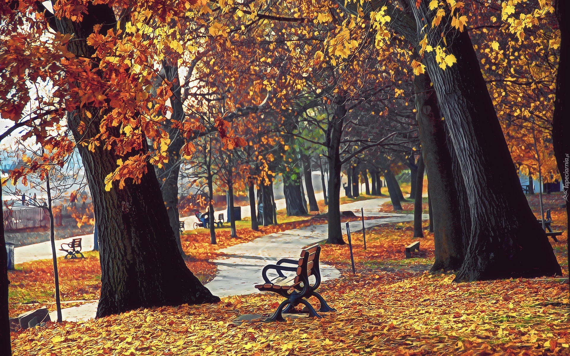 Edytor tapety: Park, Ławeczki, Opadłe, Liście, Rozmycie