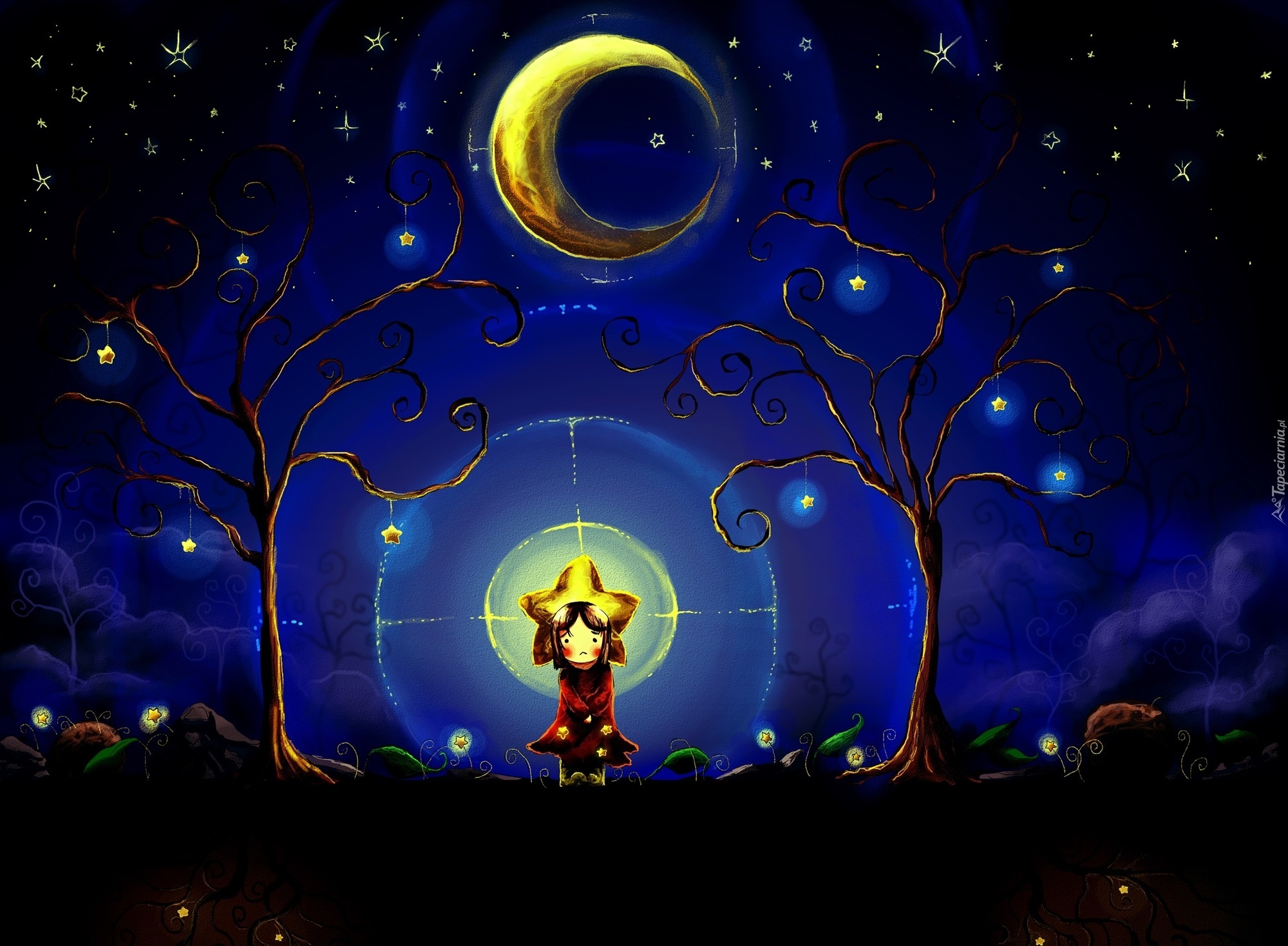 Edytor tapety: Chibionpu, Gwiazdka, Drzewa, Księżyc