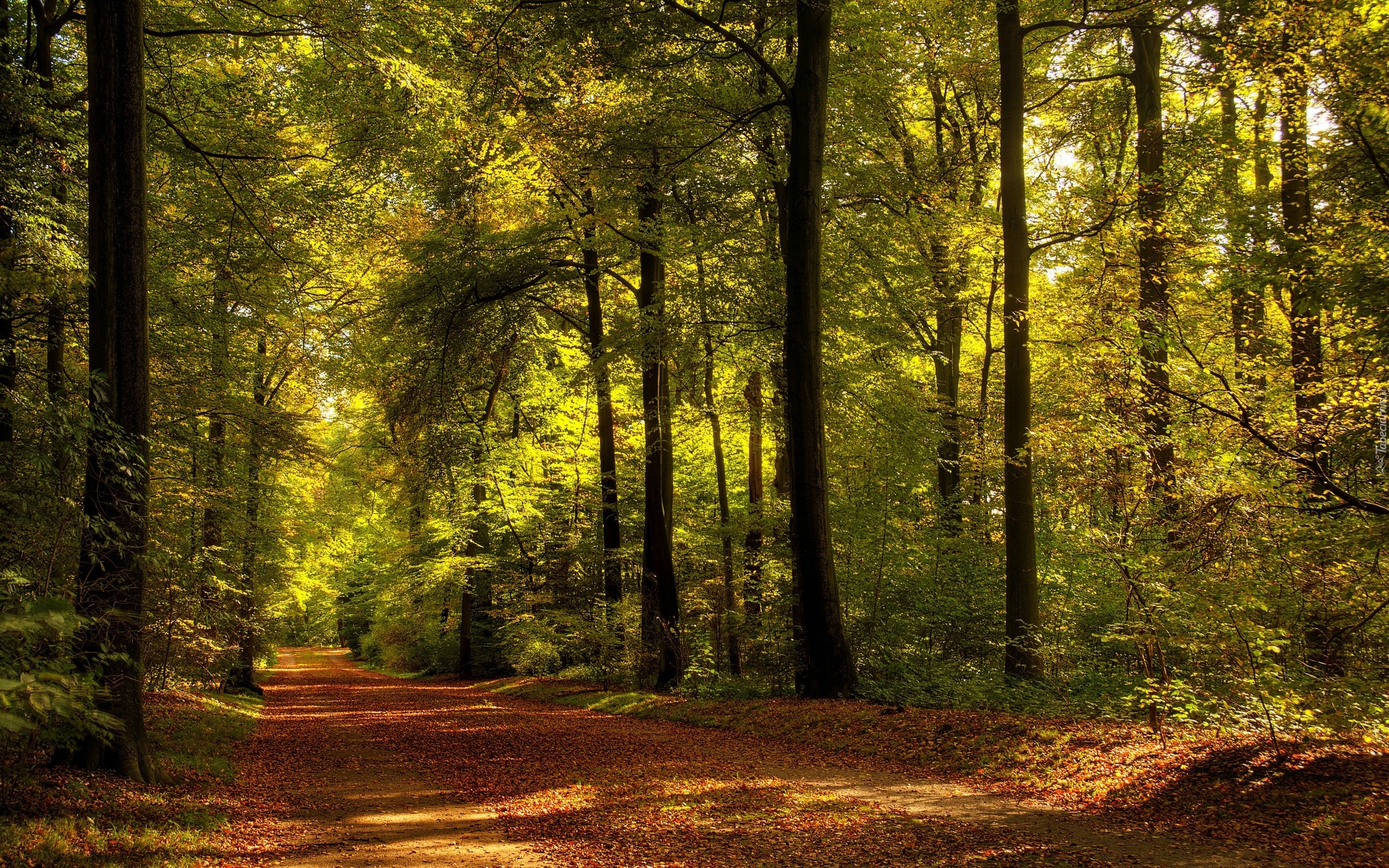 Edytor tapety: Las, Droga, Liście, Przebijające, Światło, Jesień