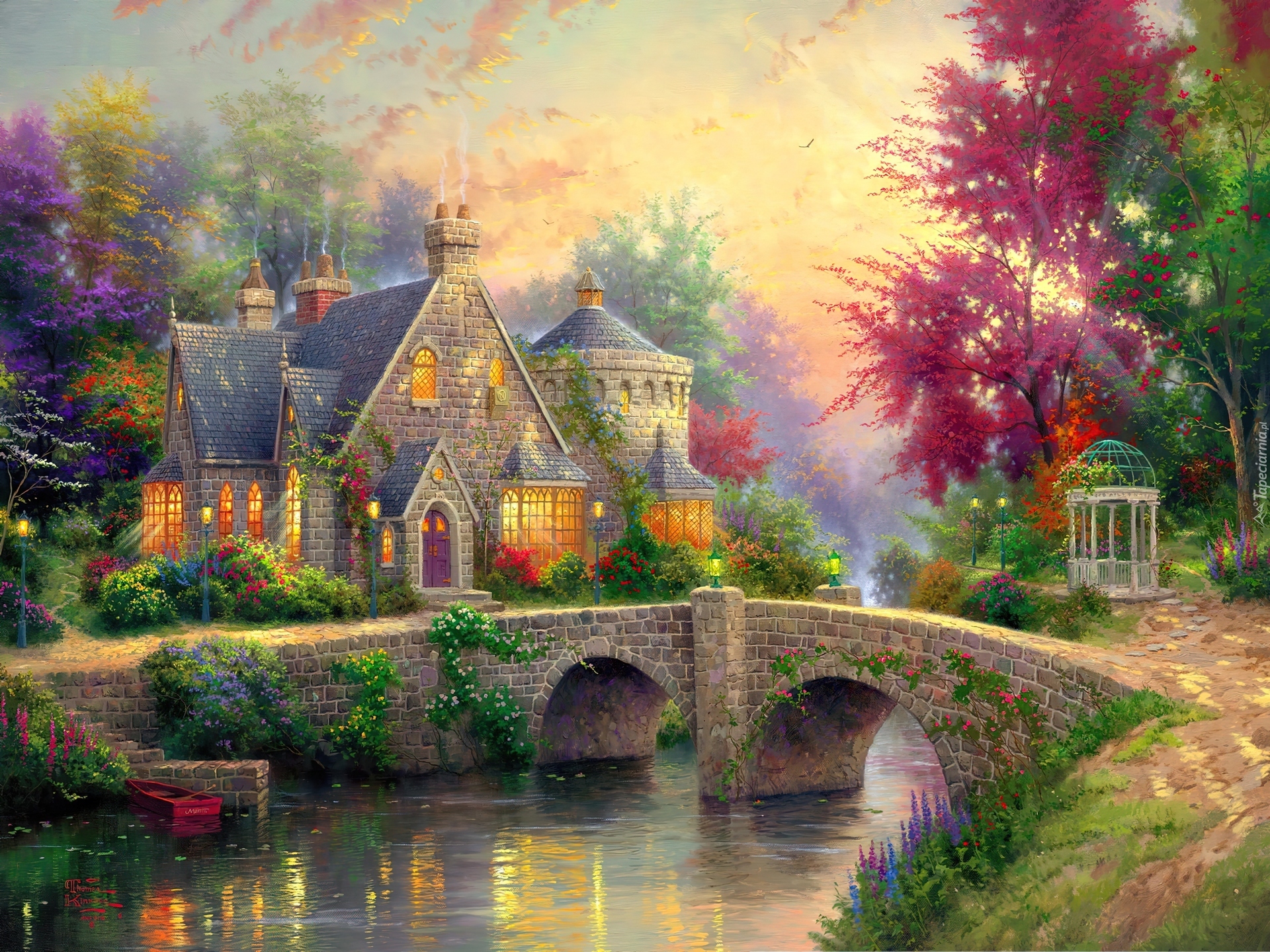 Edytor tapety: Malowniczy, Domek, Most,Rzeka
