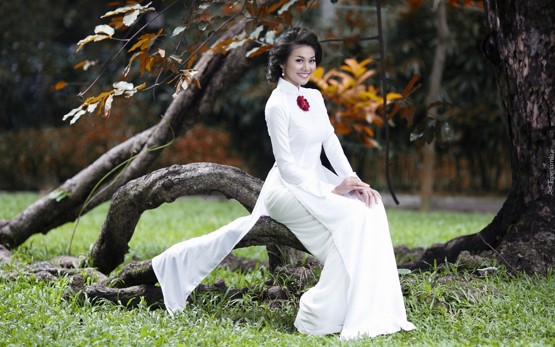 Edytor tapety: Uśmiechnięta, Brunetka, Park, Drzewa, Jesień