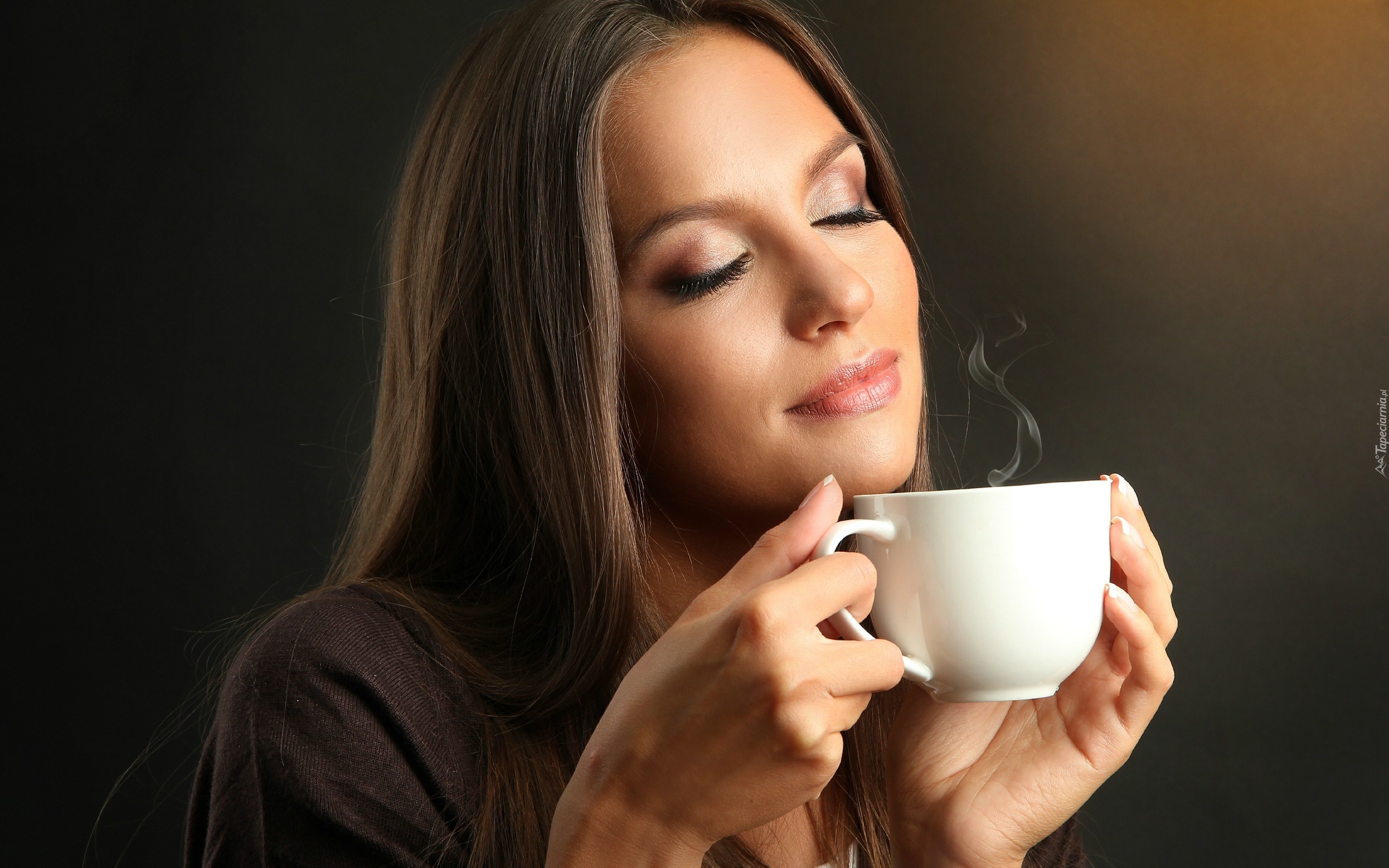 Edytor tapety: Rozmarzona, Kobieta, Makijaż, Filiżanka, Kawy