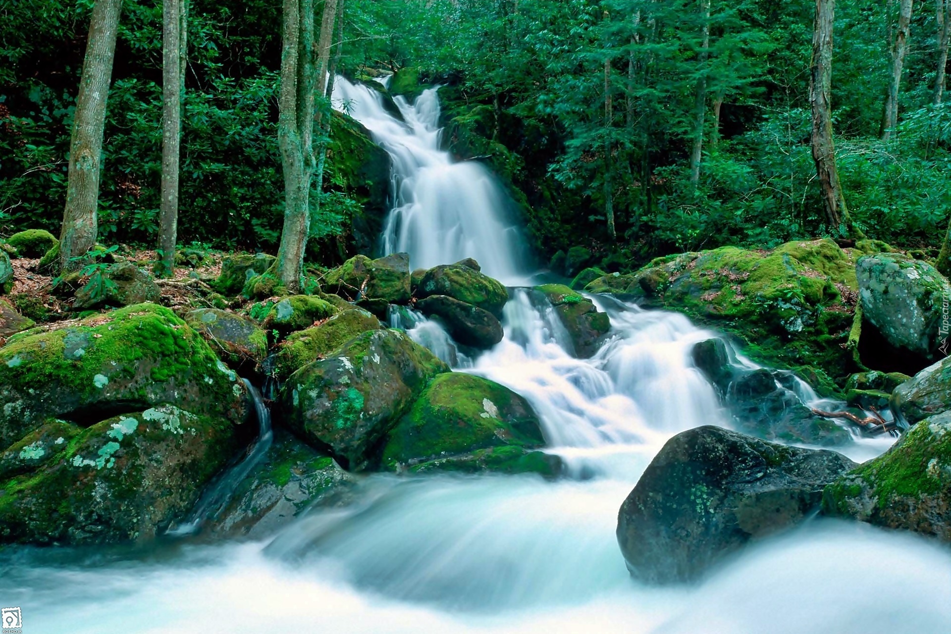 Edytor tapety: Las, Głazy, Mchy, Wodospad