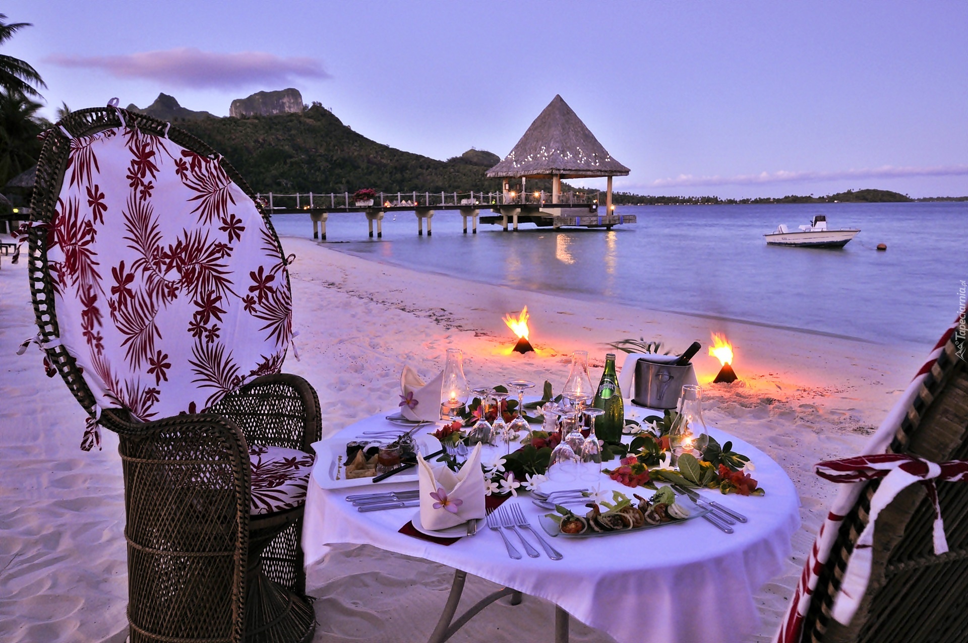 Edytor tapety: Bora Bora, Wieczór, Morze, Plaża, Restauracja