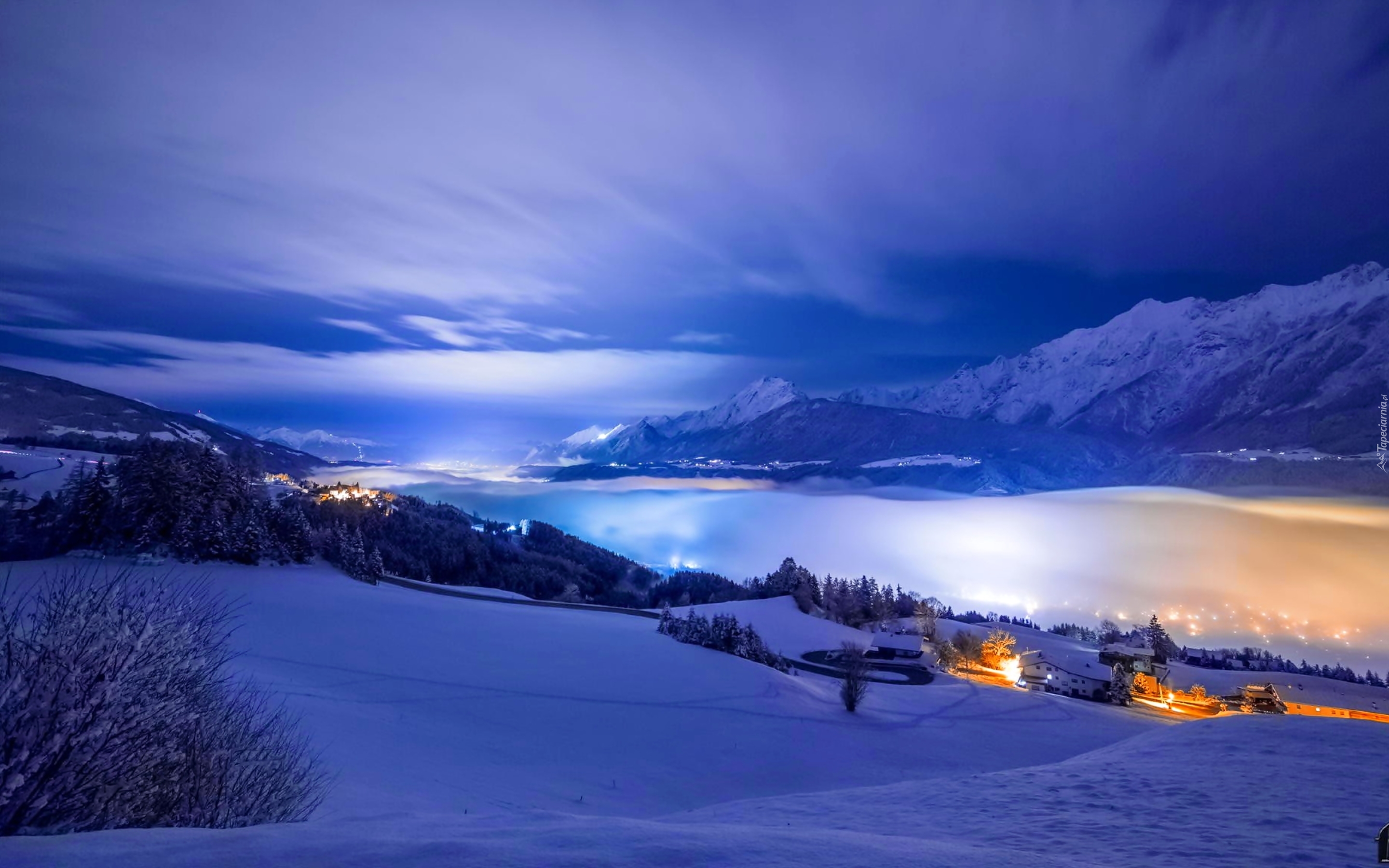 Edytor tapety: Góry, Lasy, Mgła, Domy, Noc, Zima