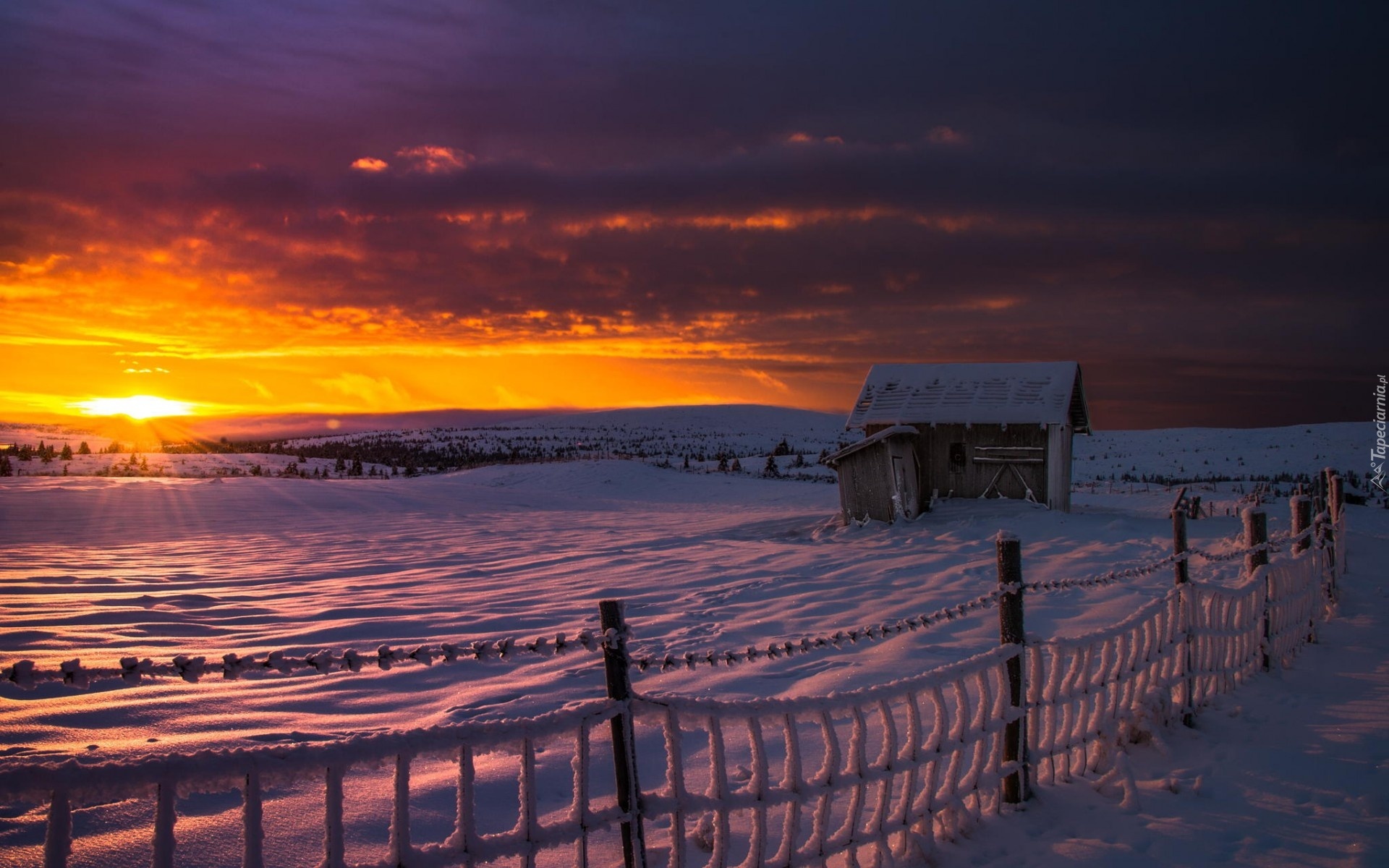 Edytor tapety: Pola, Szopa, Ogrodzenie, Chmury, Zachód, Słońca, Zima