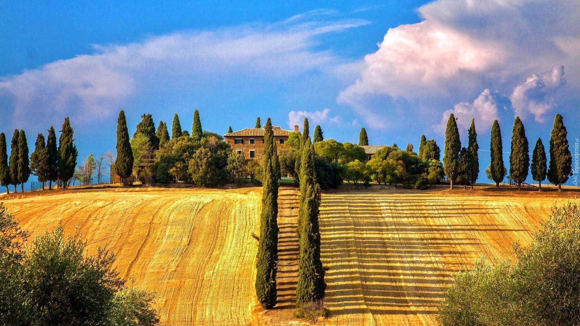 Edytor tapety: Toskania, Dom, Droga, Pola, Cyprysy, Obłoki, Cienie