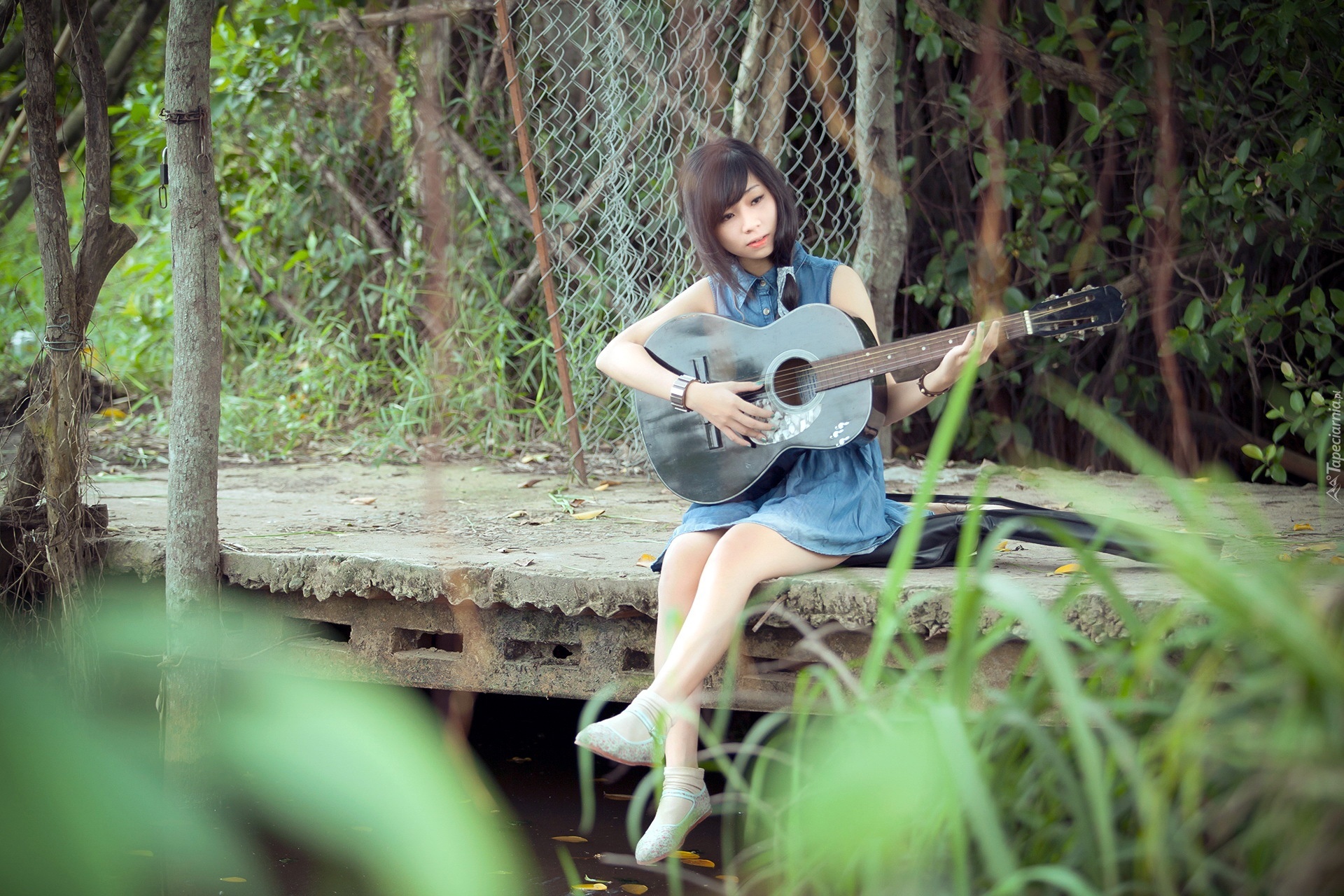 Edytor tapety: Dziewczyna, Gitara, Las, Mostek