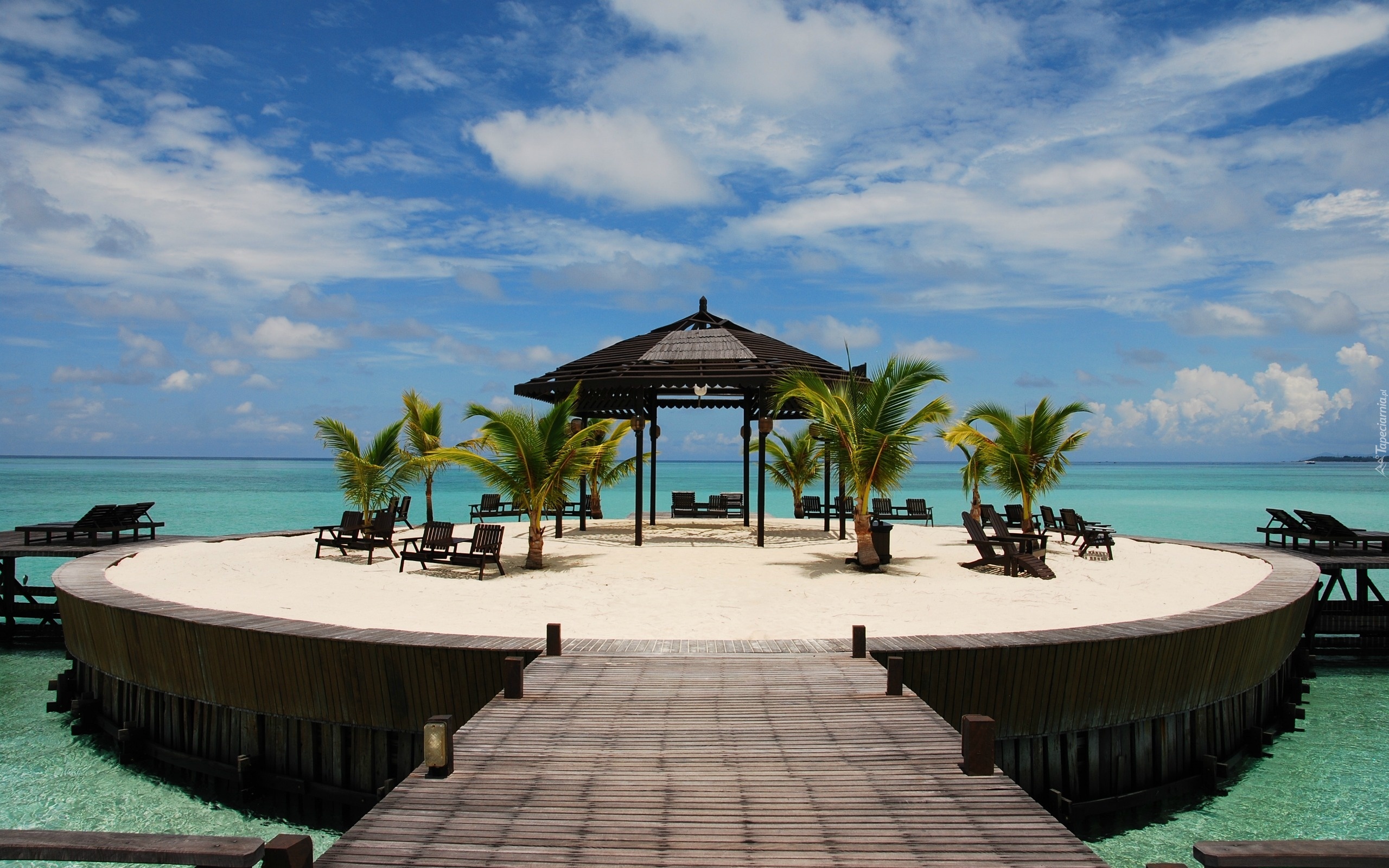 Edytor tapety: Pomost, Zadaszenie, Altana, Palmy, Leżaki, Morze, Tropiki, Wakacje
