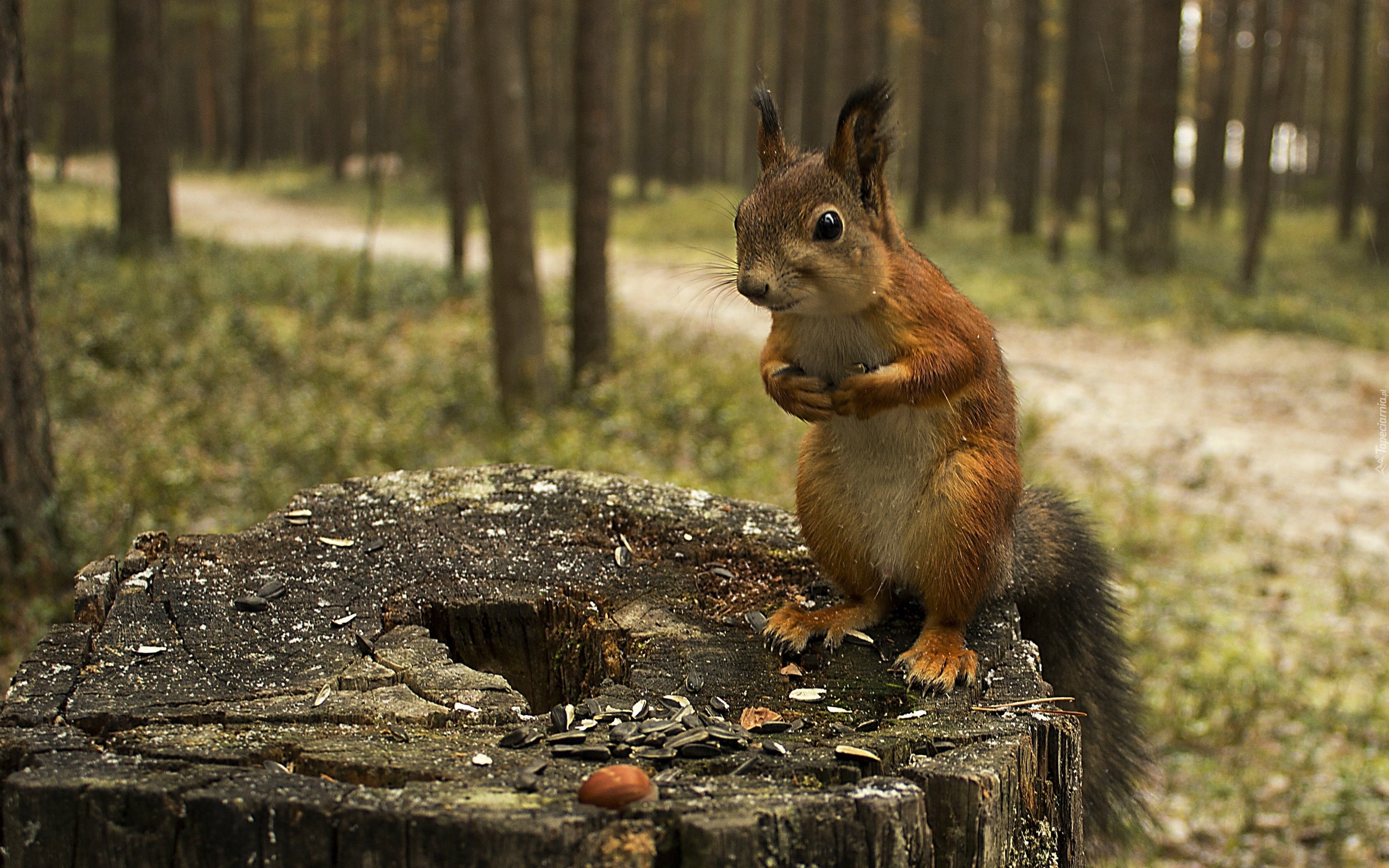 Edytor tapety: Wiewiórka, Pień, Drzewa, Pestki, Słonecznika, Las