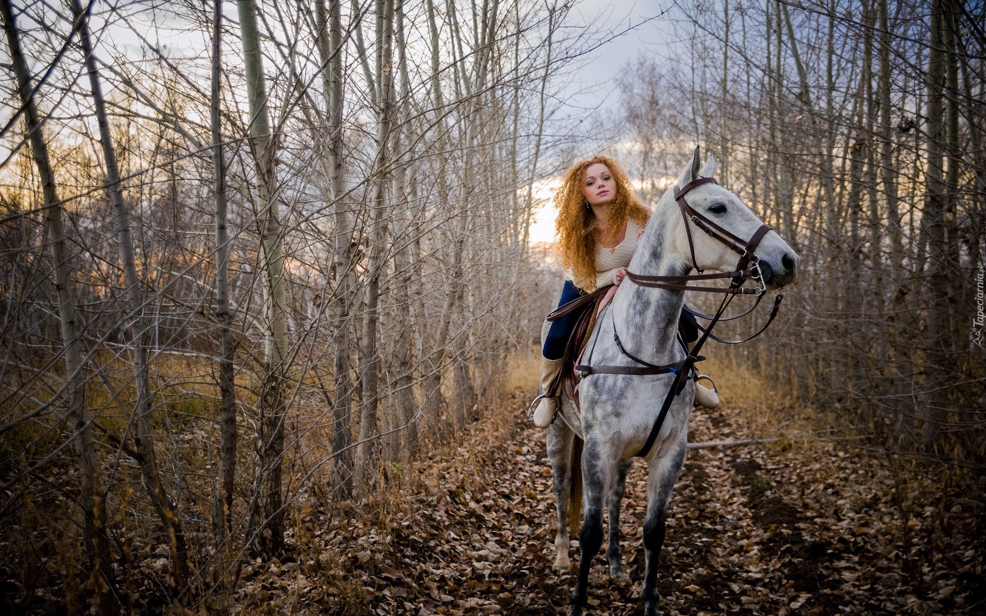 Edytor tapety: Dziewczyna, Koń, Droga, Las, Liście, Jesień