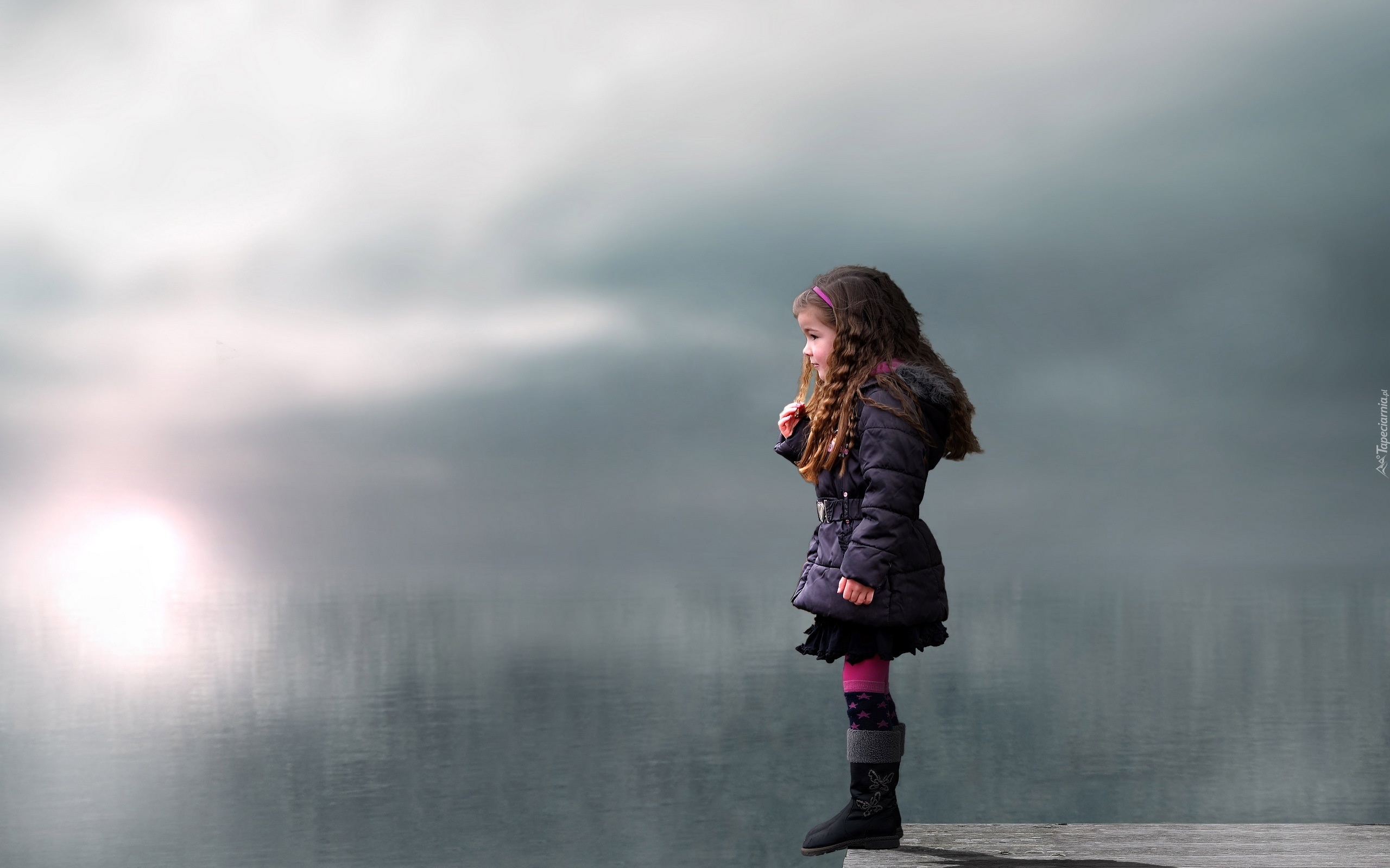 Edytor tapety: Dziewczynka, Pomost, Jezioro, Mgła