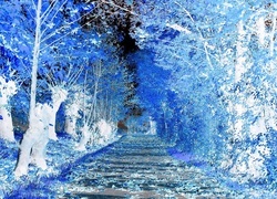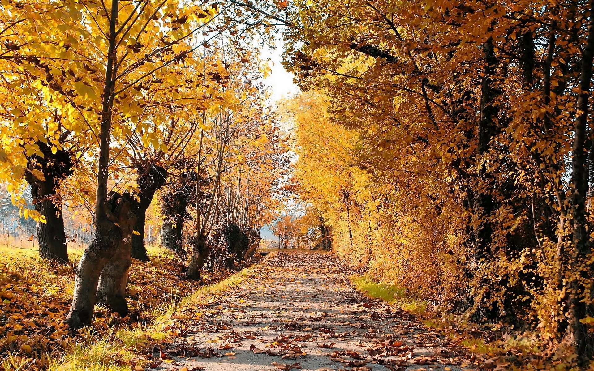 Edytor tapety: Jesień, Droga, Drzewa, Opadłe, Liście, Światło, Cień