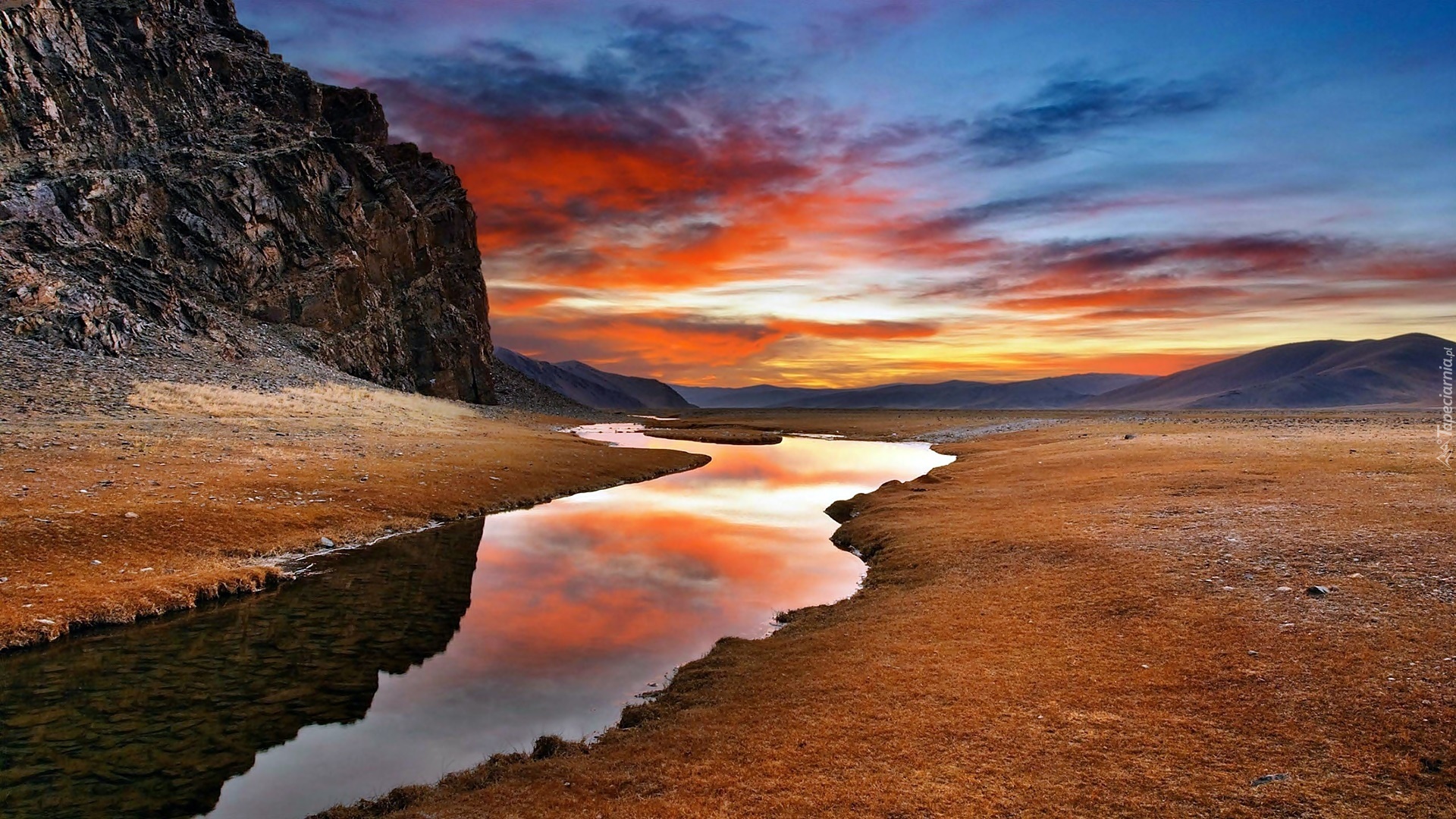 Edytor tapety: Zachód, Słońca, Chmury, Góry, Rzeka, Step