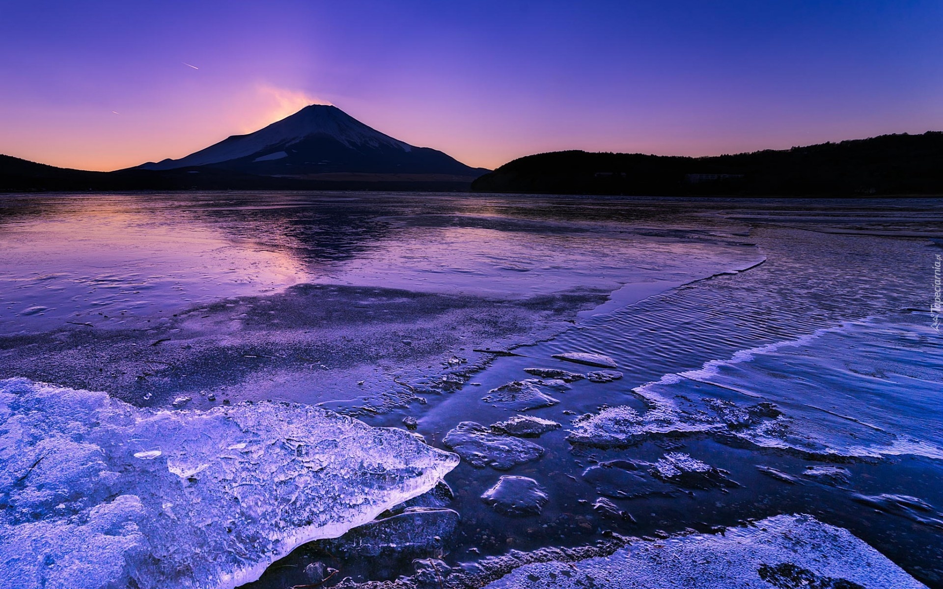 Edytor tapety: Jezioro, Kry, Lodowe, Góry, Zachód, Słońca, Zima
