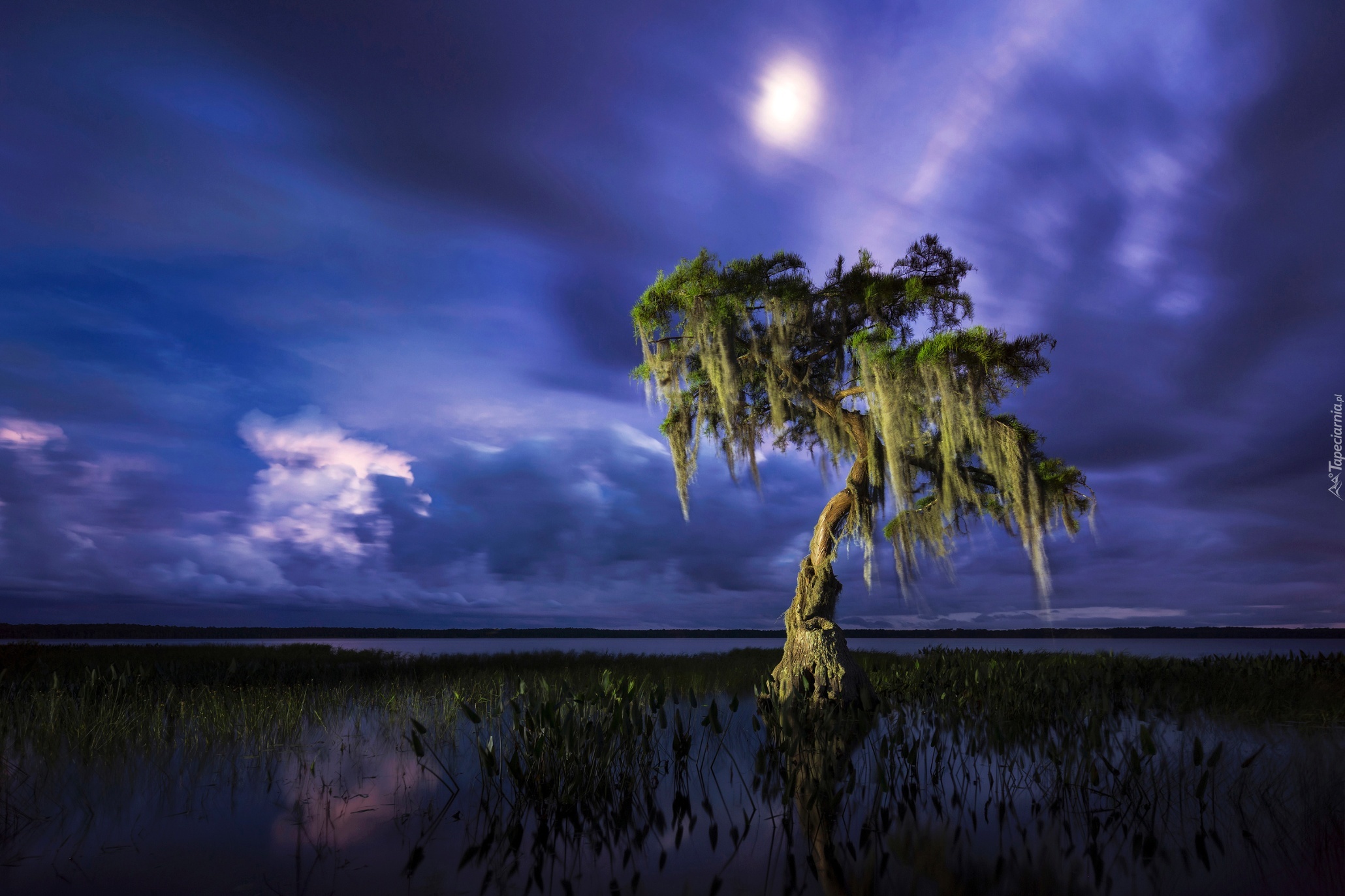 Edytor tapety: Drzewo, Jezioro, Noc, Niebo