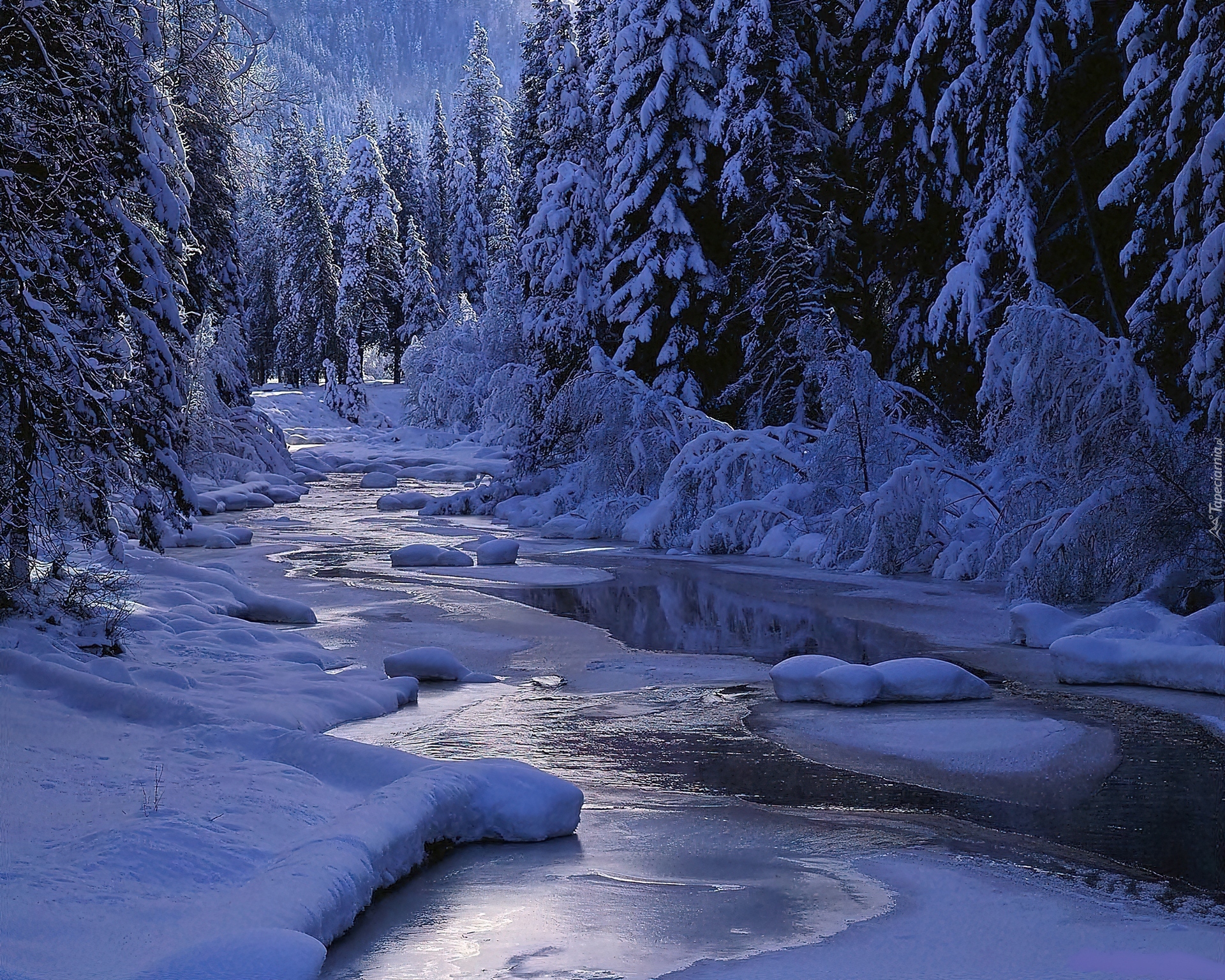 Edytor tapety: Zima, Noc, Las, Rzeka, Światło, Cień