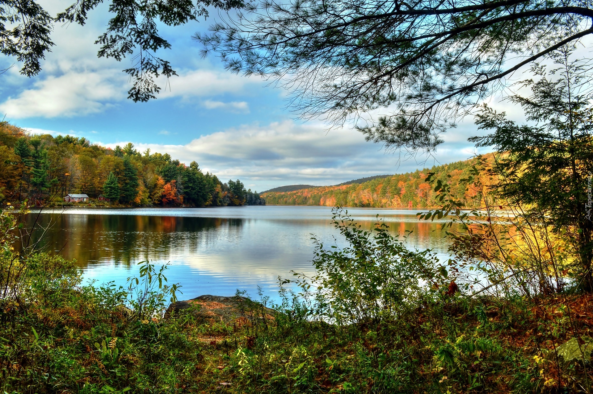 Edytor tapety: Jesień, Wzgórza, Lasy, Jezioro, Dom