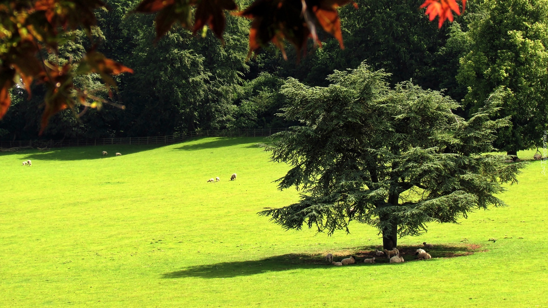 Edytor tapety: Lato, Las, Łąka, Owce, Przebijające, Światło