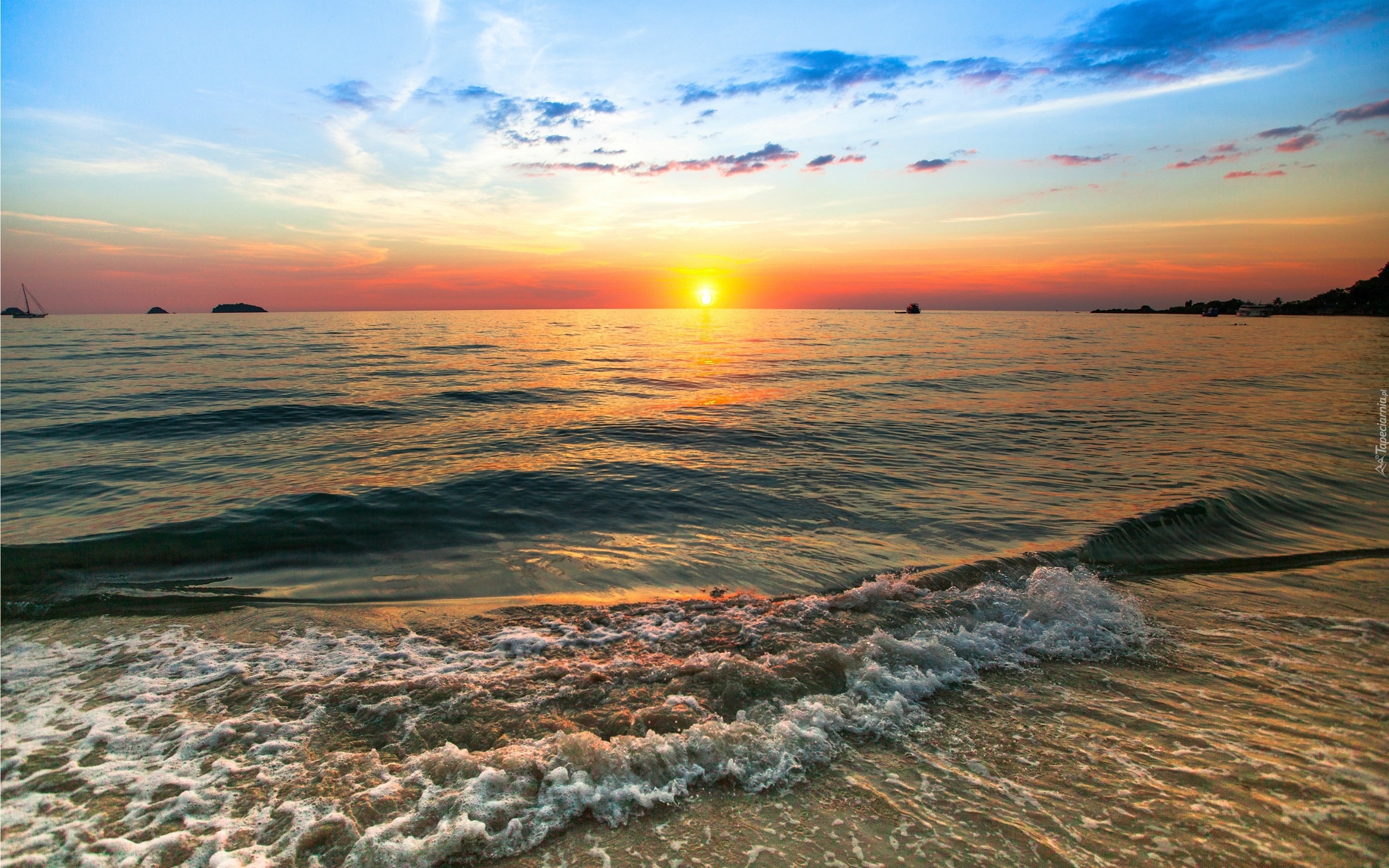 Edytor tapety: Morze, Fale, Wyspa, Statki, Łodzie, Zachód, Słońca