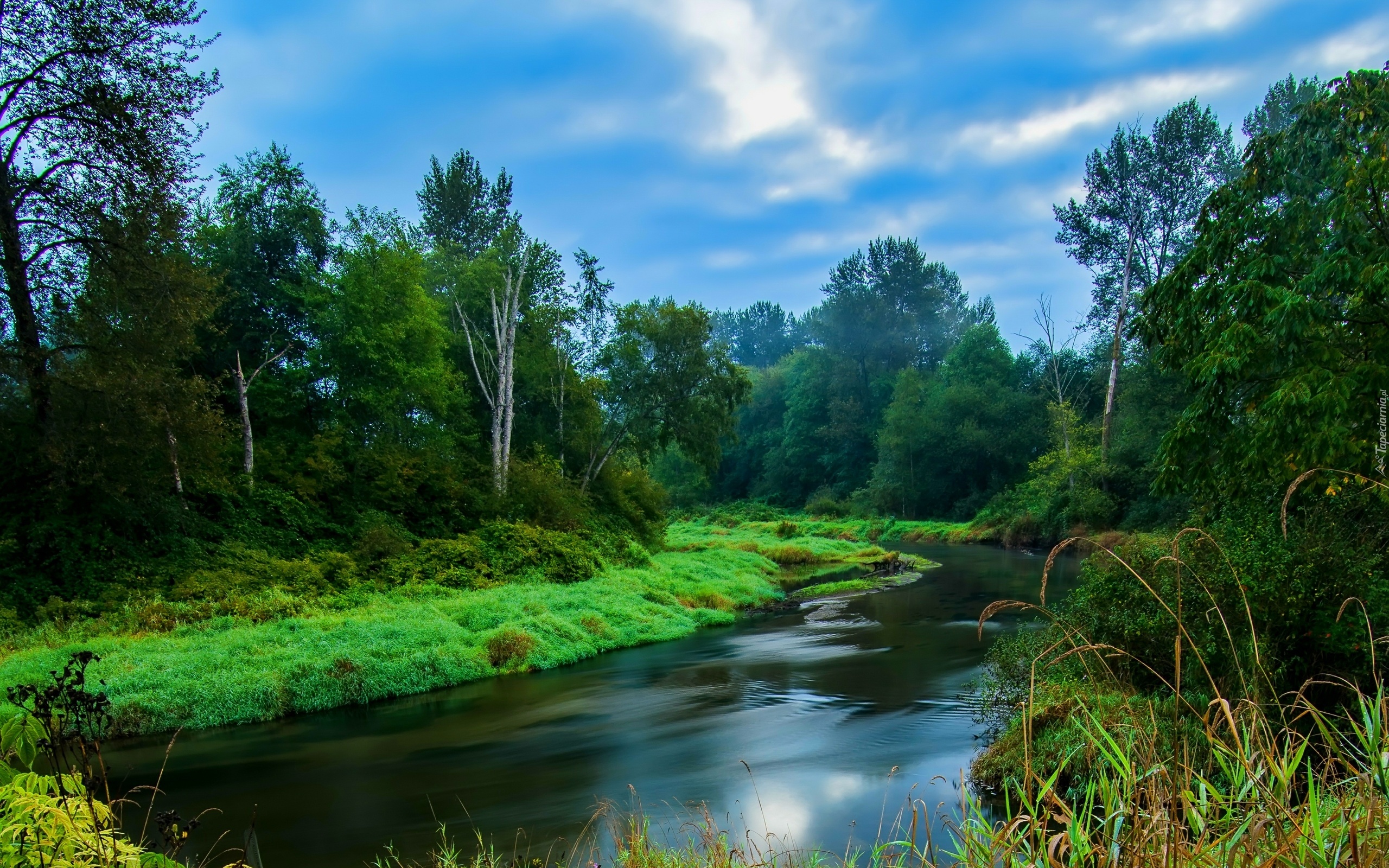 Edytor tapety: Rzeka, Las, Trawy, Chmury