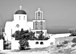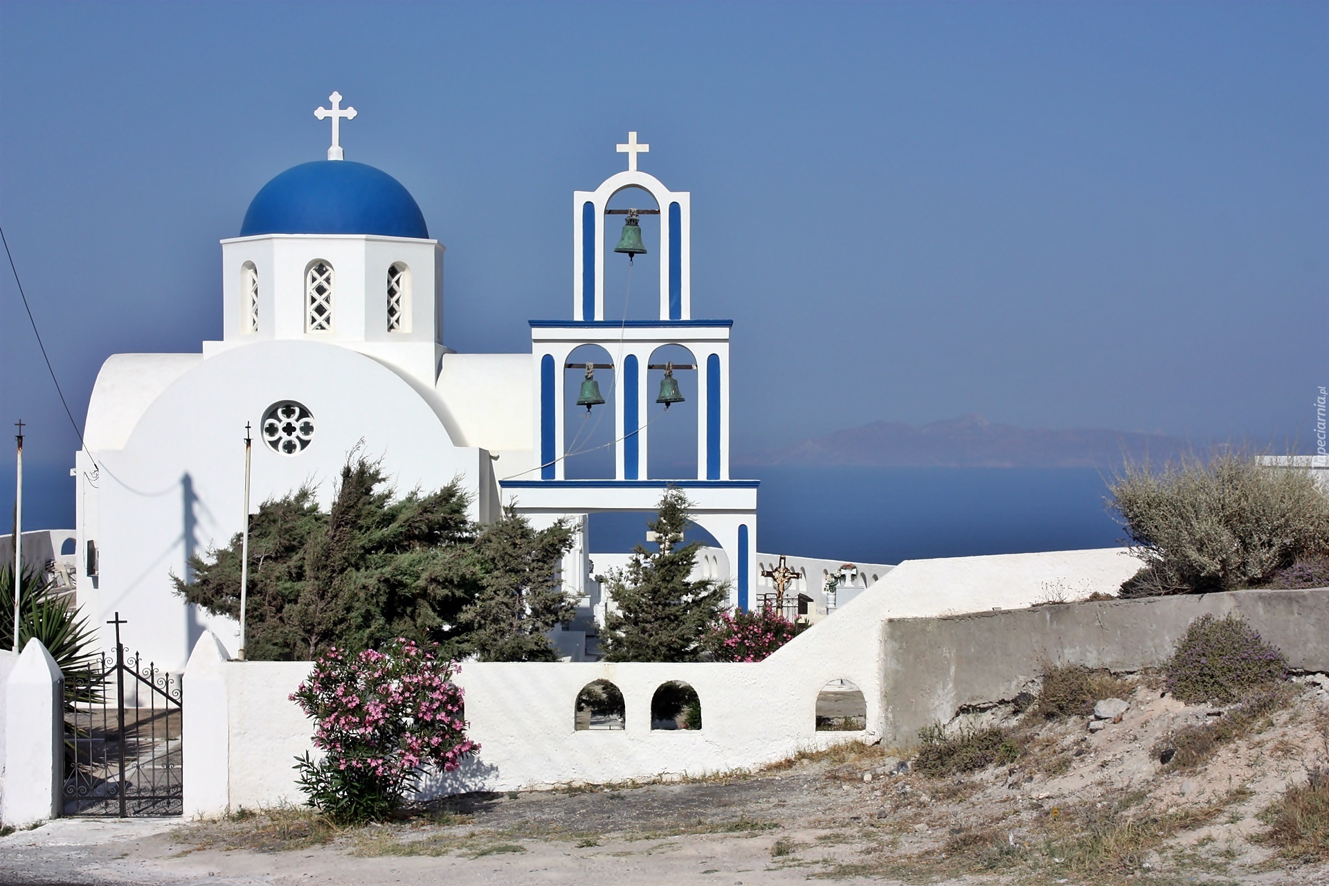 Edytor tapety: Santorini, Cerkiew, Morze, Roślinność, Grecja