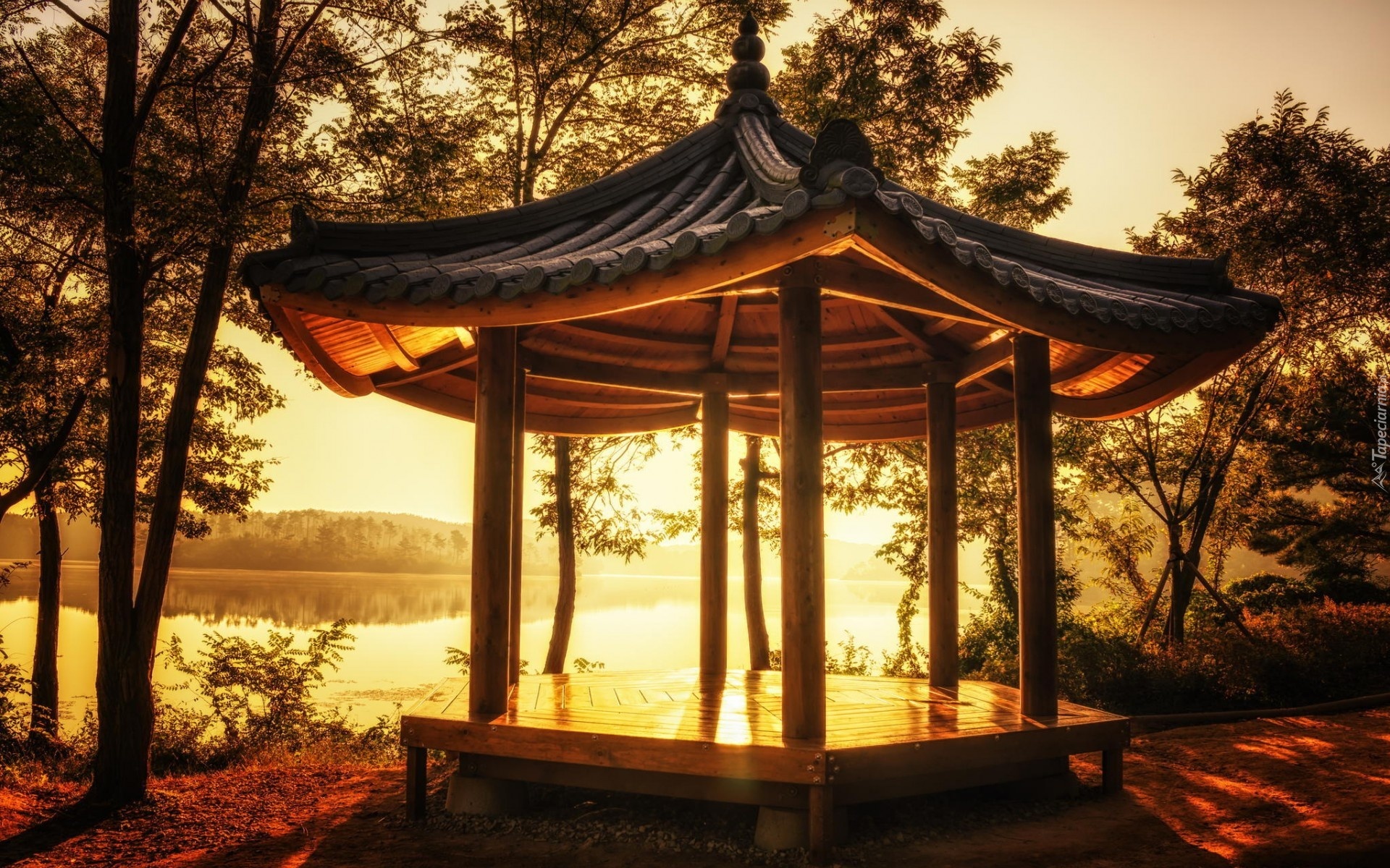 Edytor tapety: Jezioro, Altana, Droga, Promienie słońca, Jesień