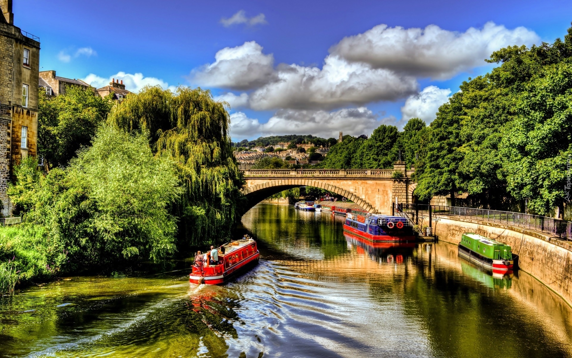 Edytor tapety: Rzeka, Łodzie, Most, Kamienice, Drzewa