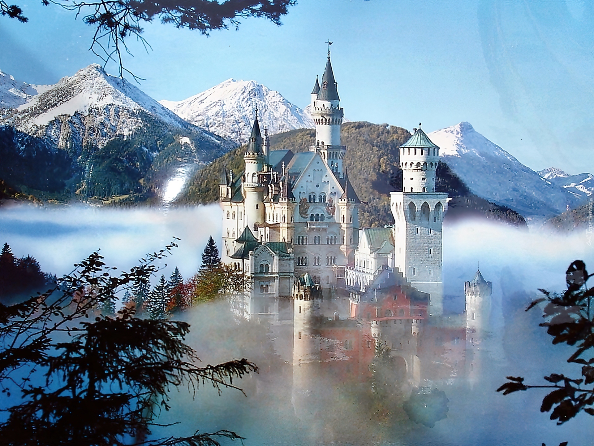 Edytor tapety: Góry, Mgła, Drzewa, Zamek, Neuschwanstein