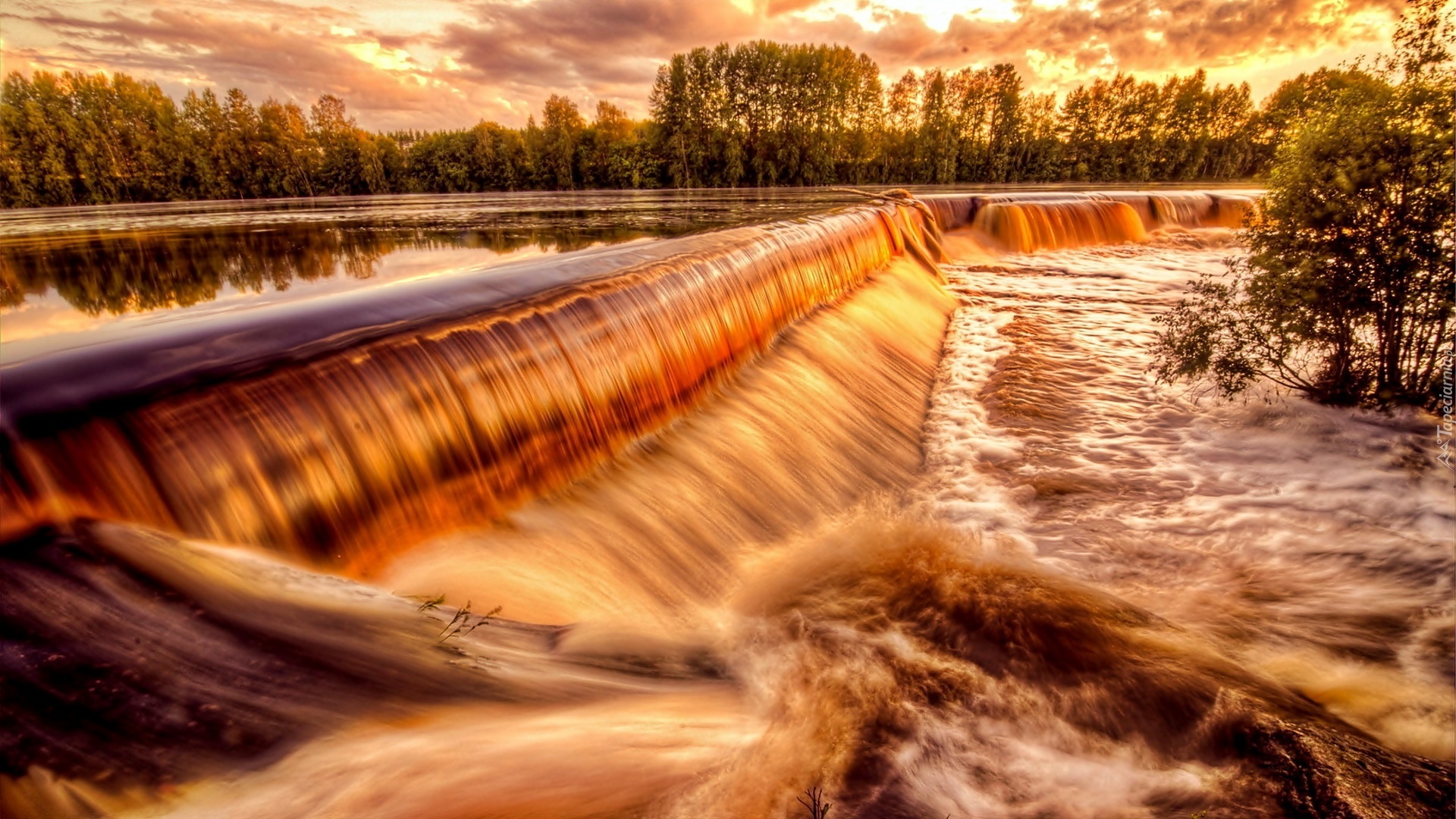 Edytor tapety: Rzeka, Wodospad, Drzewa, Chmury, Przebijające, Światło