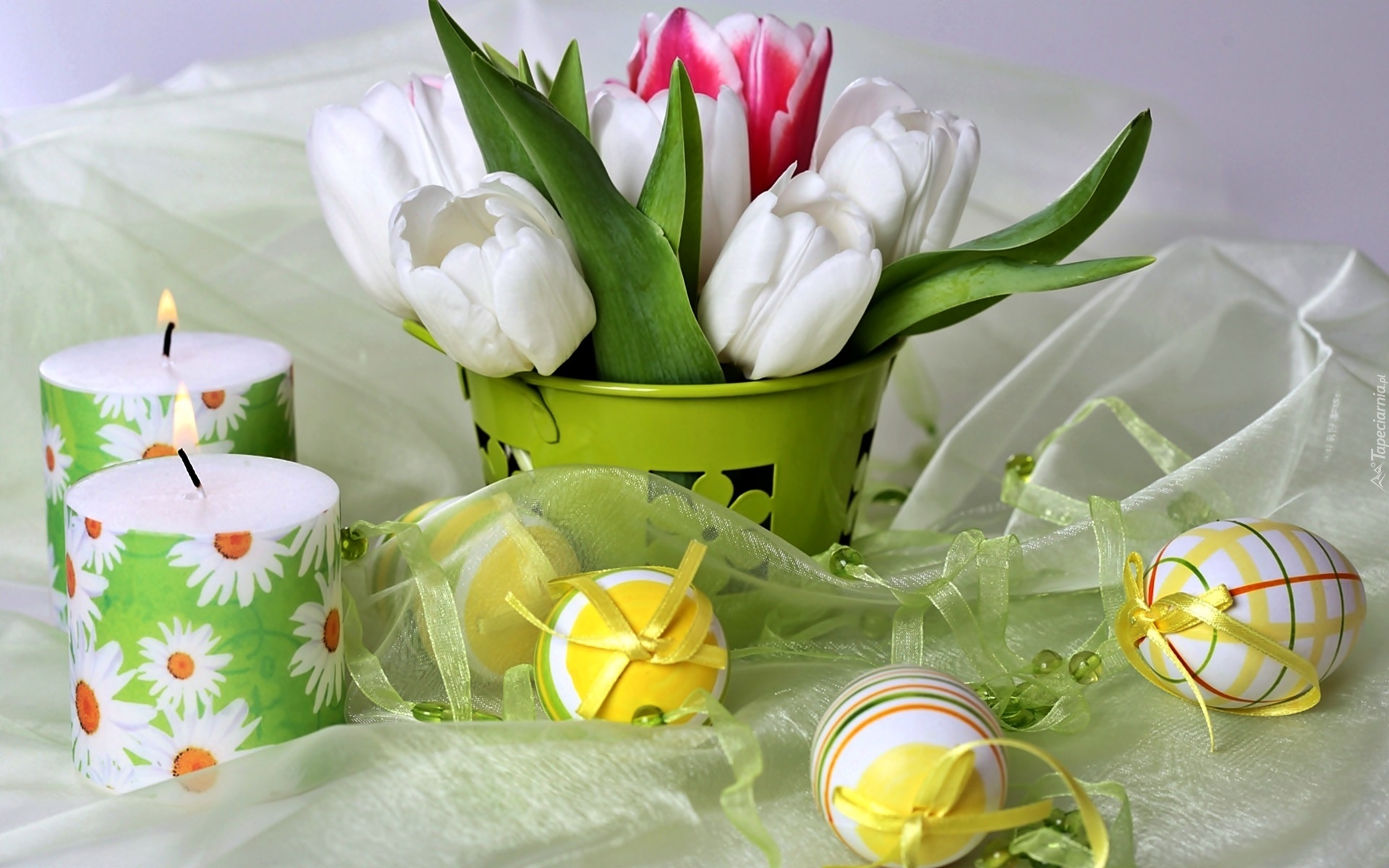 Edytor tapety: Bukiet, Tulipanów, Pisanki, Świece, Kompozycja