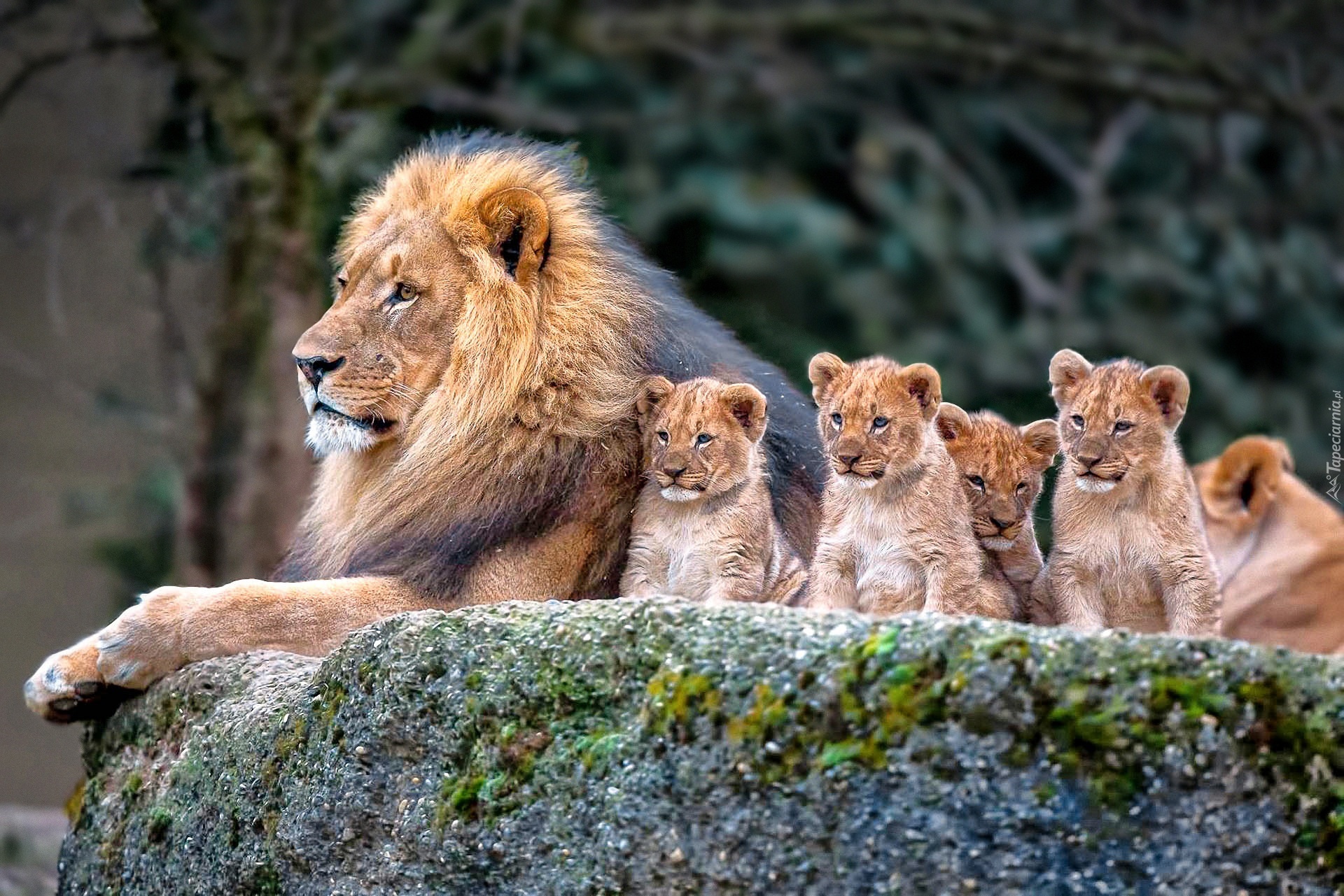 Edytor tapety: Lew, Małe, Lwiątka, Skała, Las
