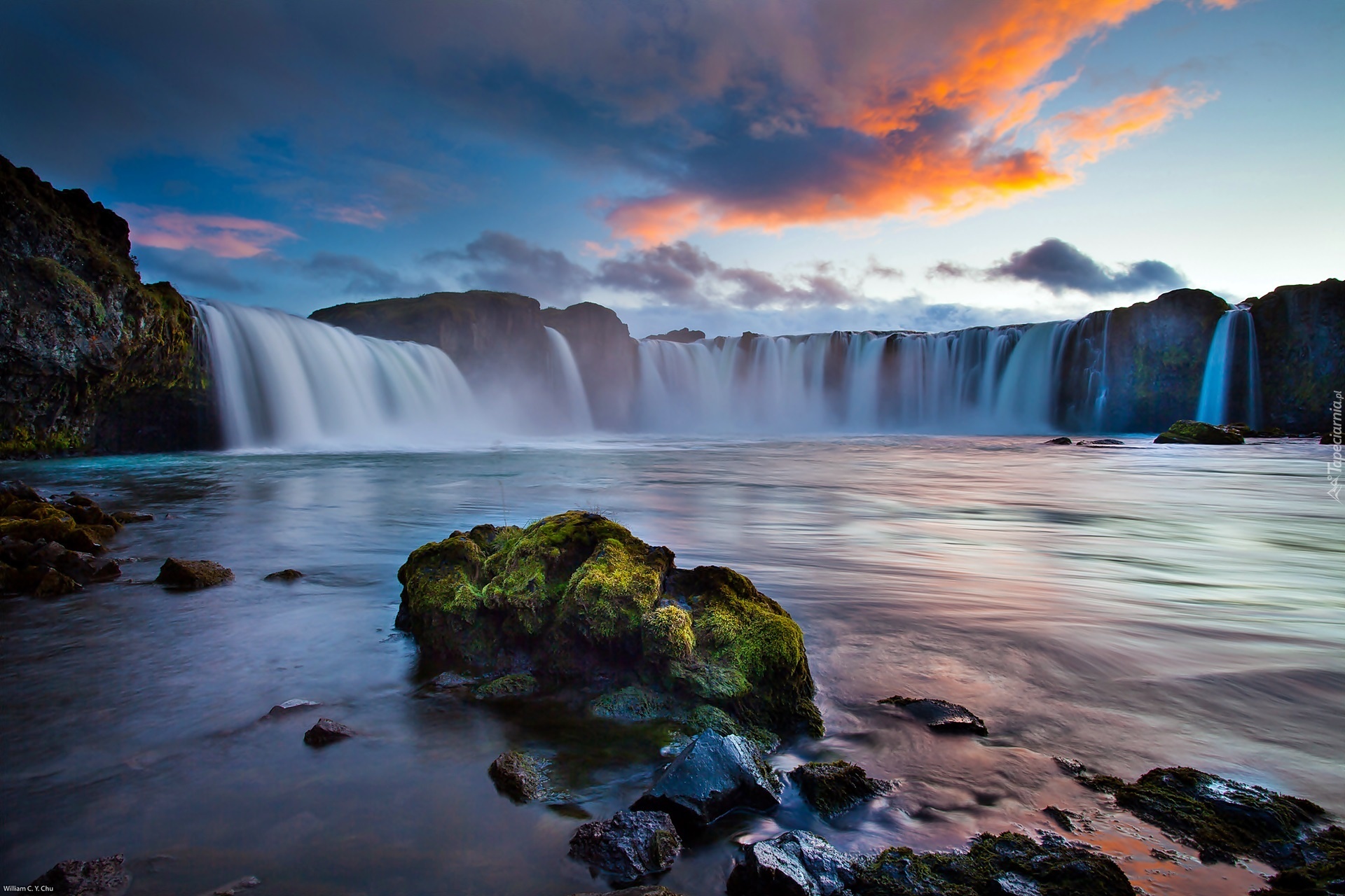 Edytor tapety: Rzeka, Skały, Wodospad, Chmury, Przebijające, Światło