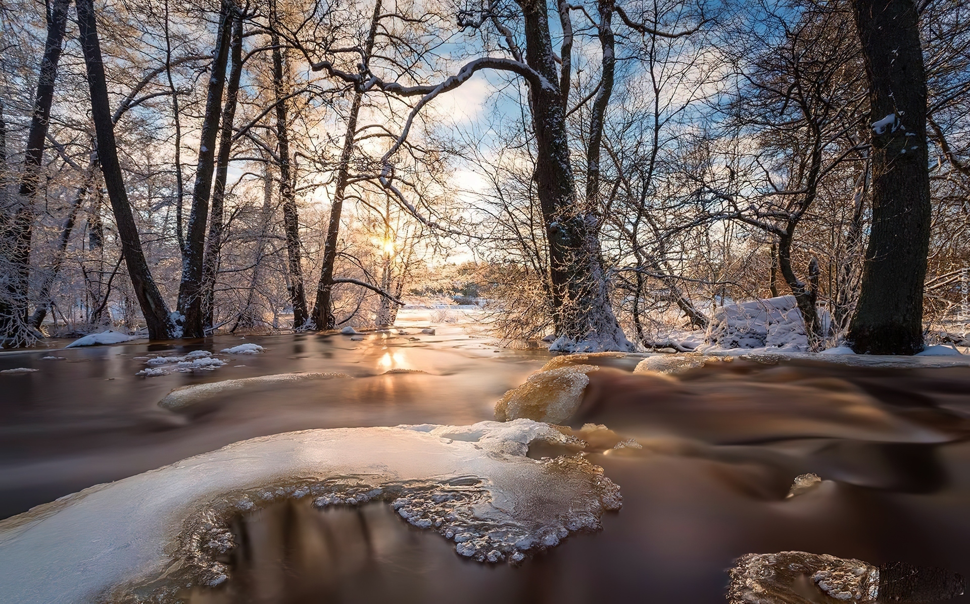 Edytor tapety: Zachód, Słońca, Drzewa, Rzeka, Śnieg