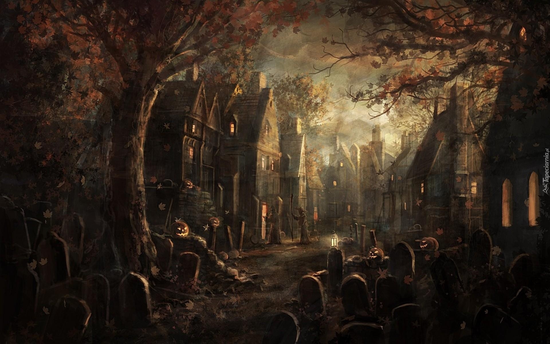 Edytor tapety: Domy, Drzewa, Jesień, Groby, Halloween