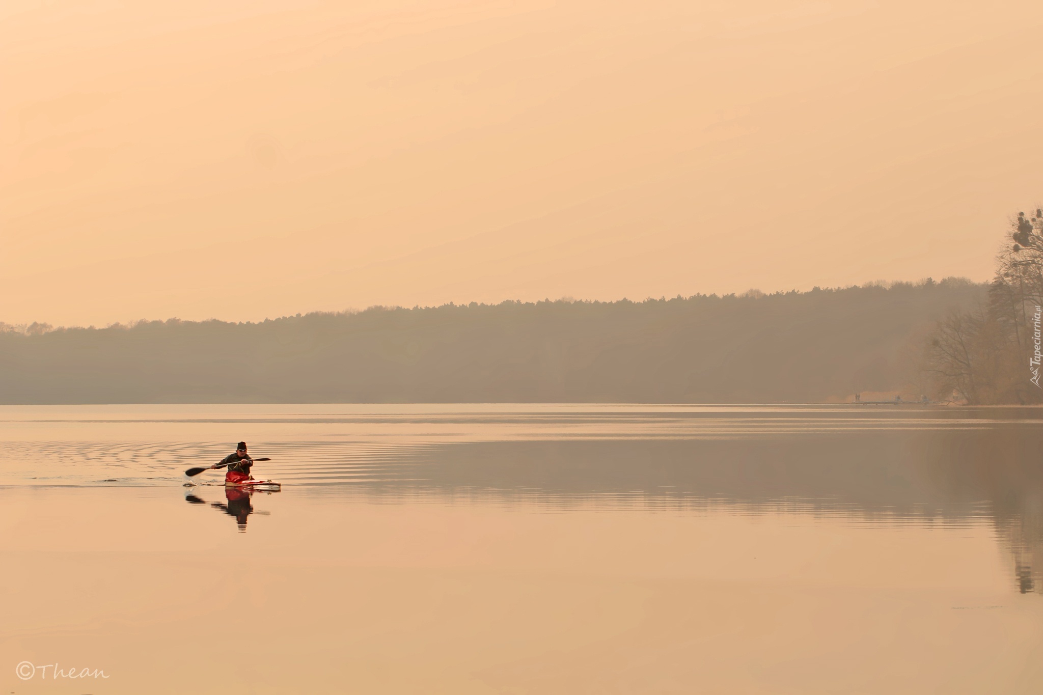 Edytor tapety: Kajakarz, Jezioro, Drzewa, Zmierzch
