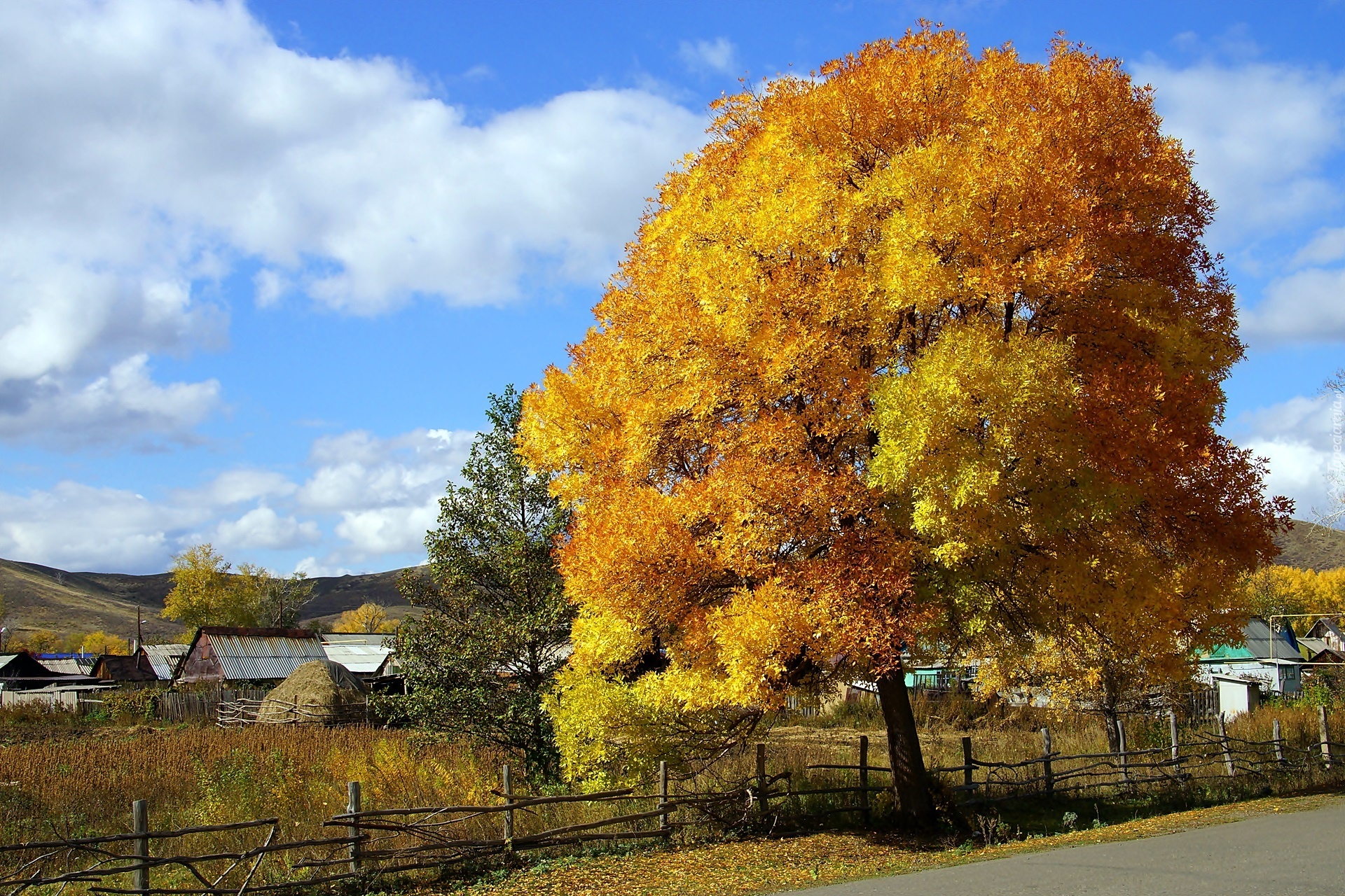 Edytor tapety: Jesień, Drzewa, Pola, Chmury, Wieś
