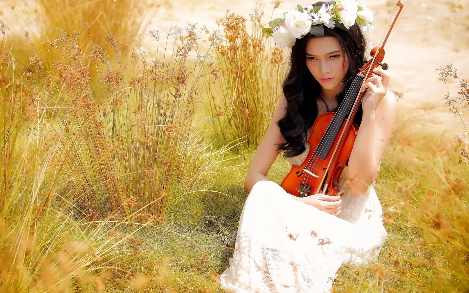 Edytor tapety: Kobieta, Trawa, Skrzypce