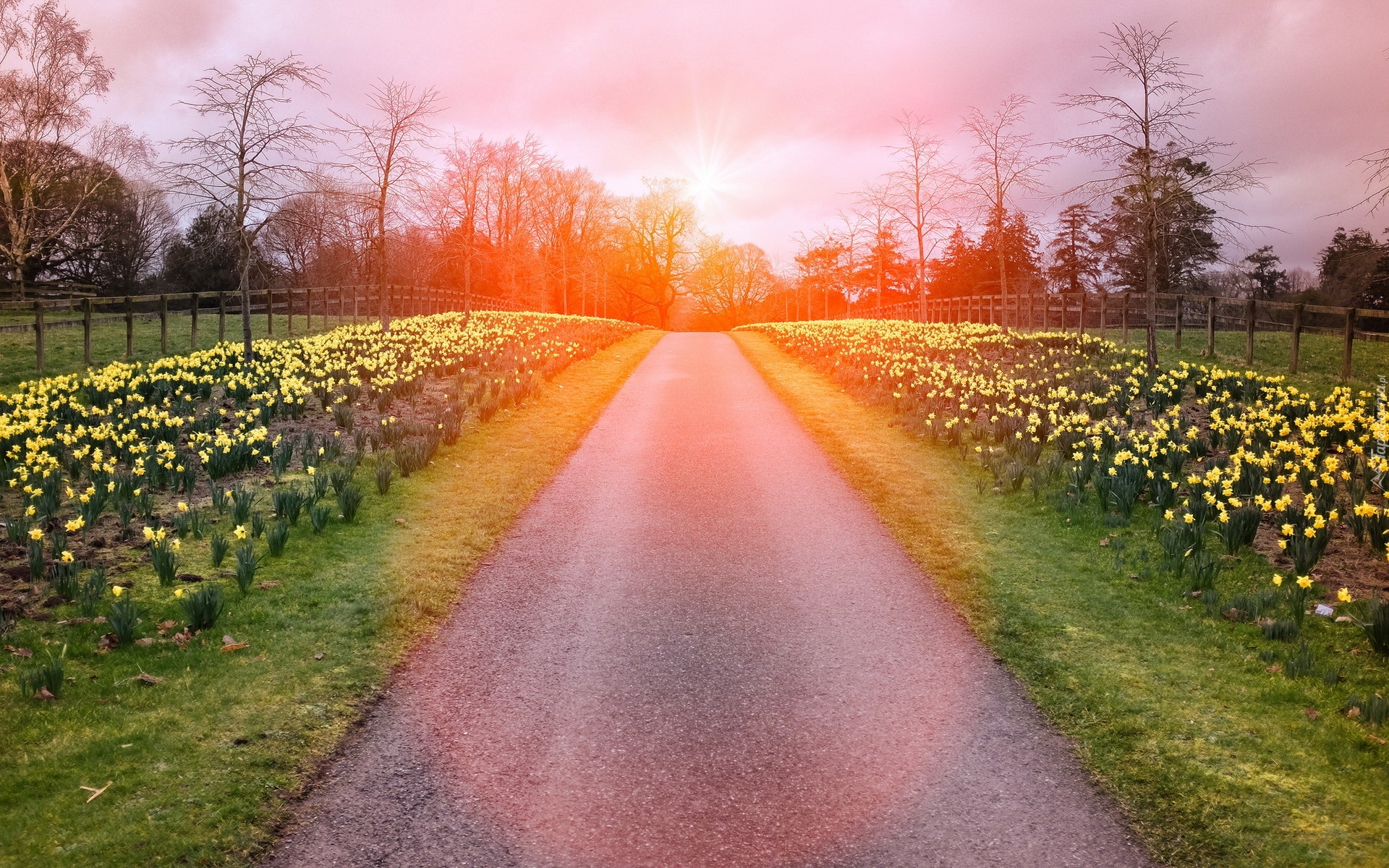 Edytor tapety: Droga, Żonkile, Blask, Drzewa