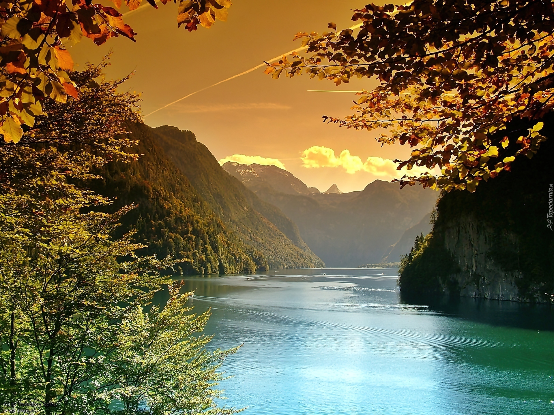 Edytor tapety: Góry, Las, Rzeka, Zachód, Słońca