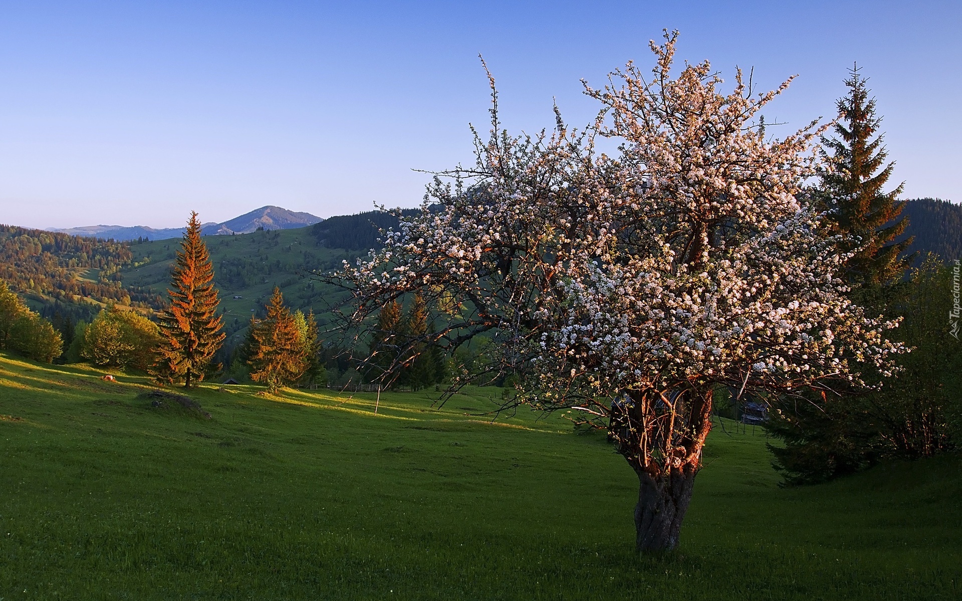 Edytor tapety: Kwitnące, Drzewo, Łąka, Lasy, Góry, Wiosna