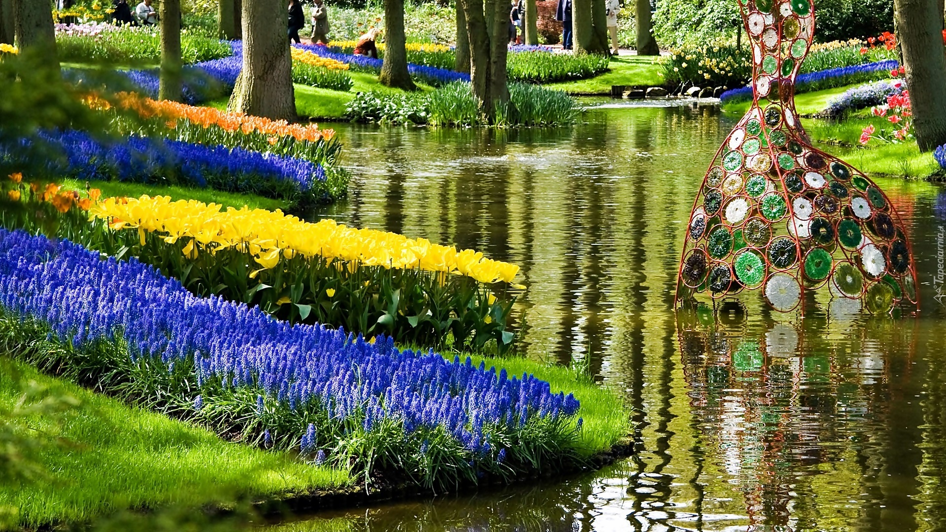 Edytor tapety: Wiosna, Park, Rzeka, Rzeźba, Kwiatowa, Spacerowicze