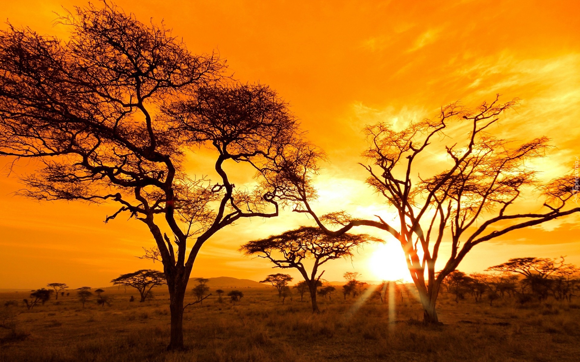 Edytor tapety: Zachód, Słońca, Promienie, Drzewa