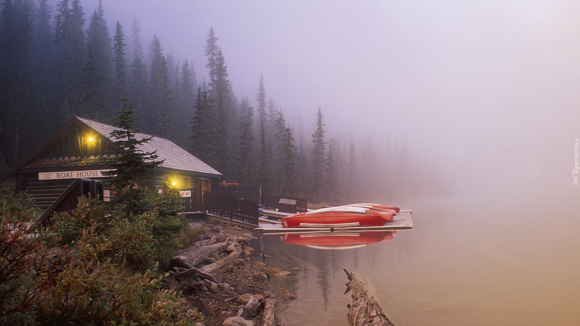 Edytor tapety: Louise, Jezioro, Kabina, Mgła, Łódź, Las