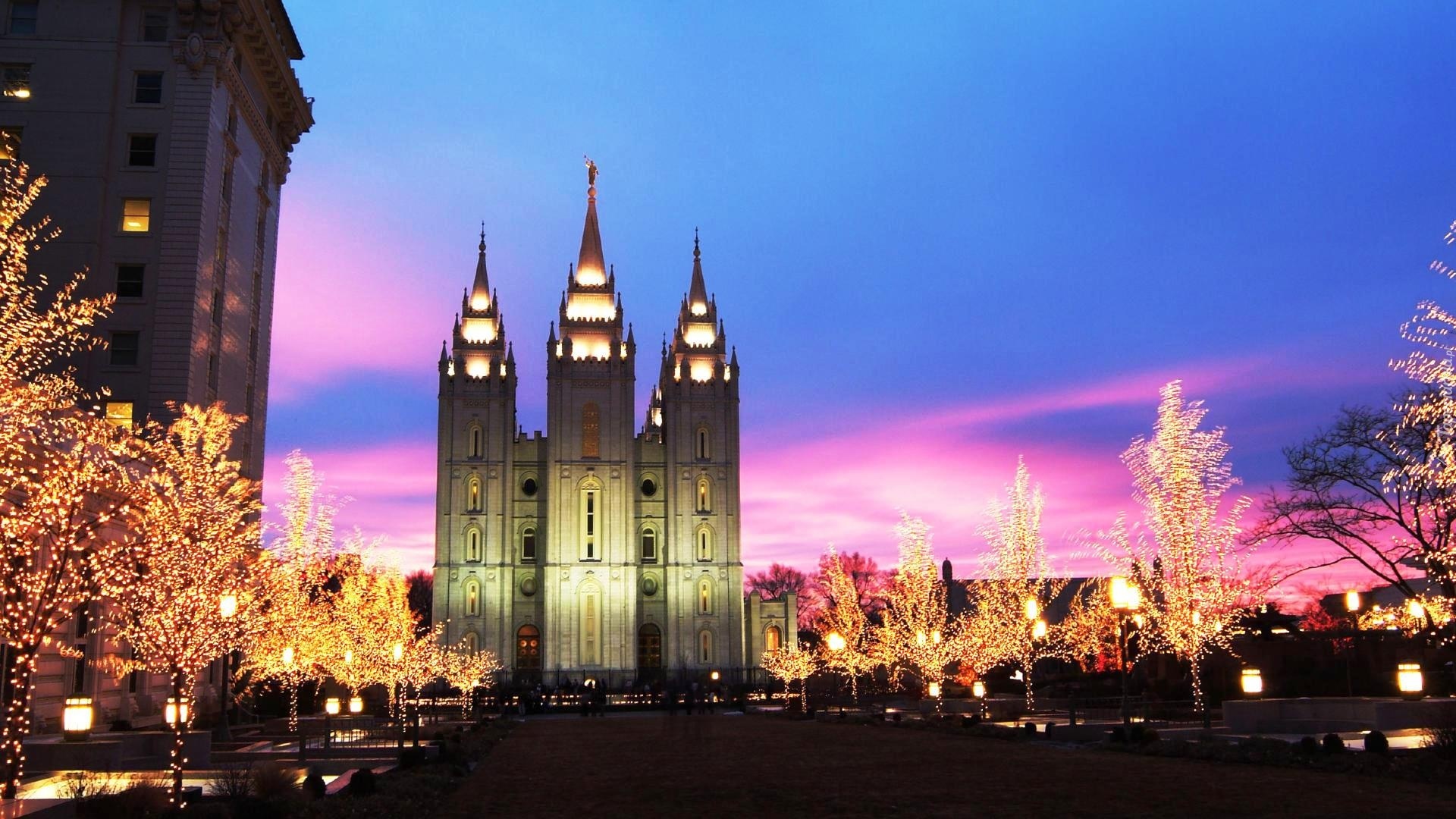 Edytor tapety: Kościół, Oświetlone, Drzewa