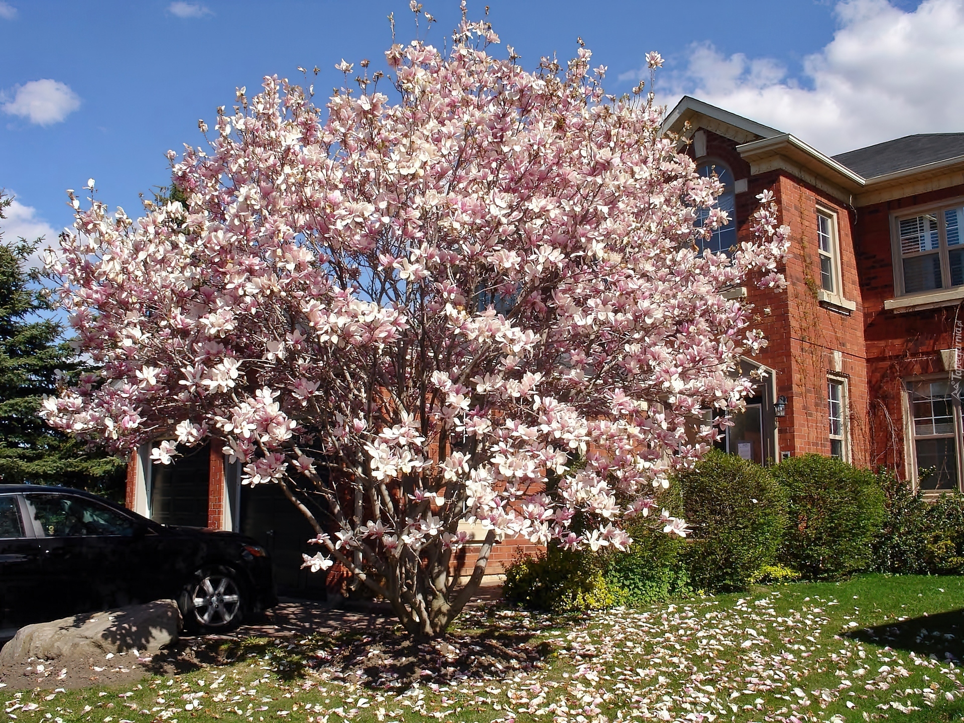 Edytor tapety: Wiosna, Dom, Ogród, Kwitnąca, Magnolia, Samochód