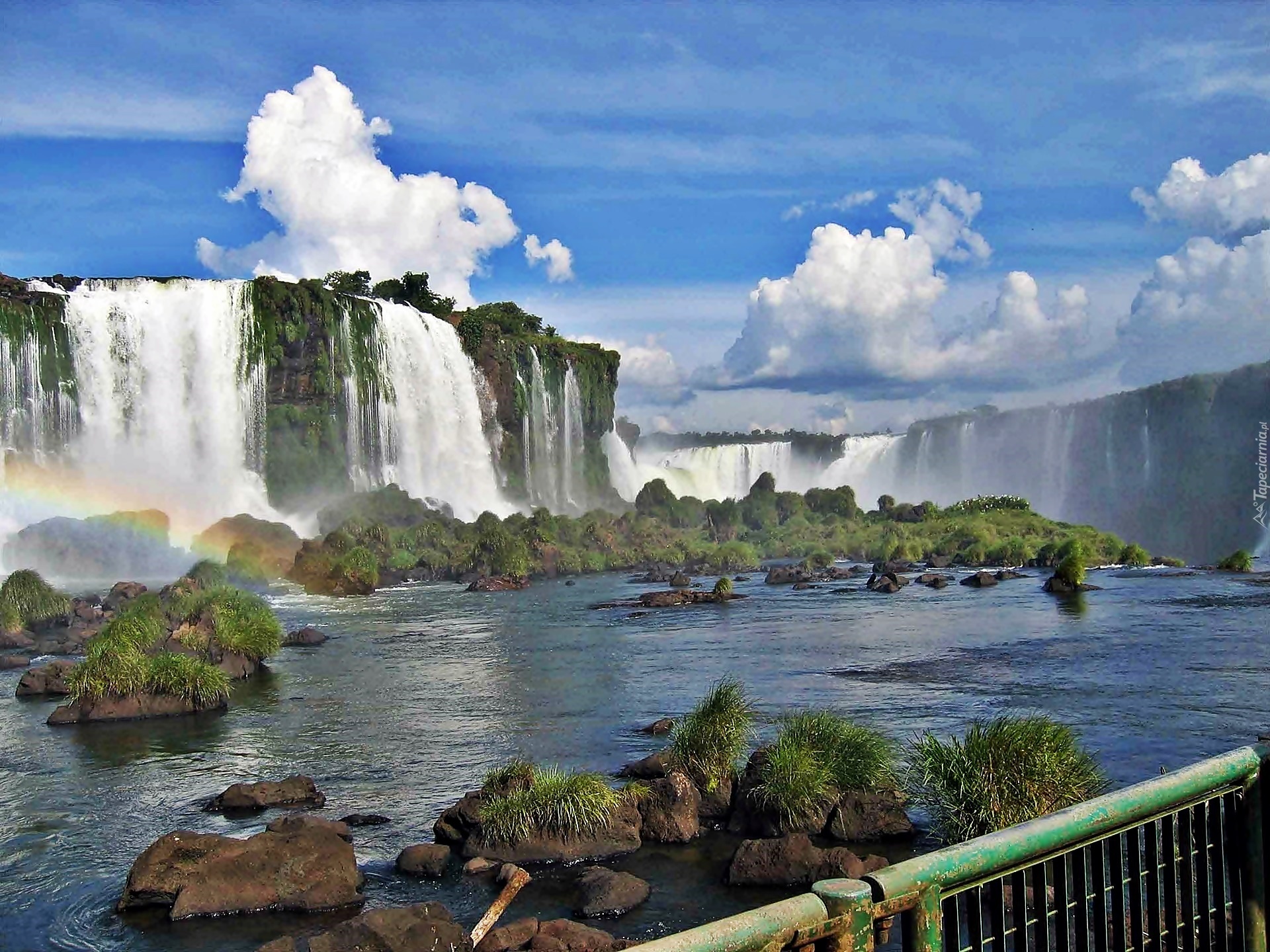 Edytor tapety: Skały, Wodospad, Rzeka, Kamienie, Obłoki, Tęcza, Trawy