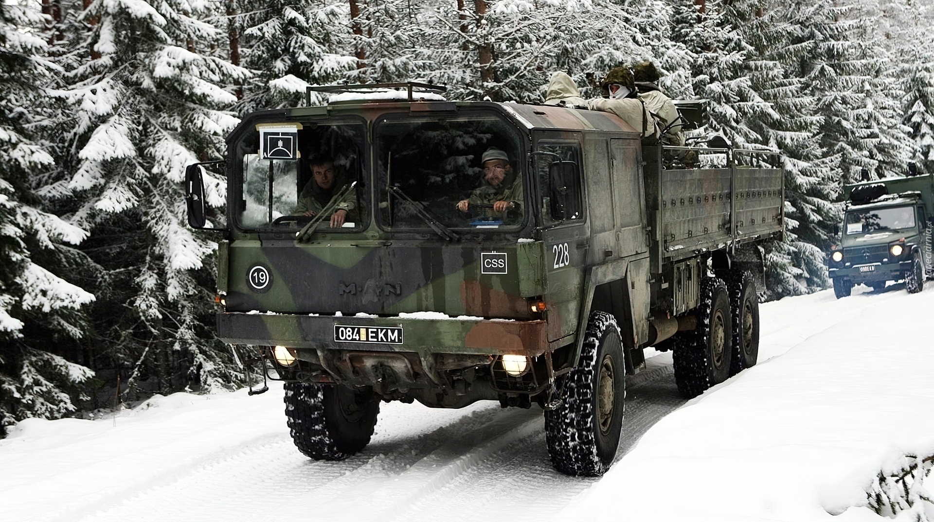 Edytor tapety: Man, Samochód, Wojskowy, Ośnieżony, Las, Droga