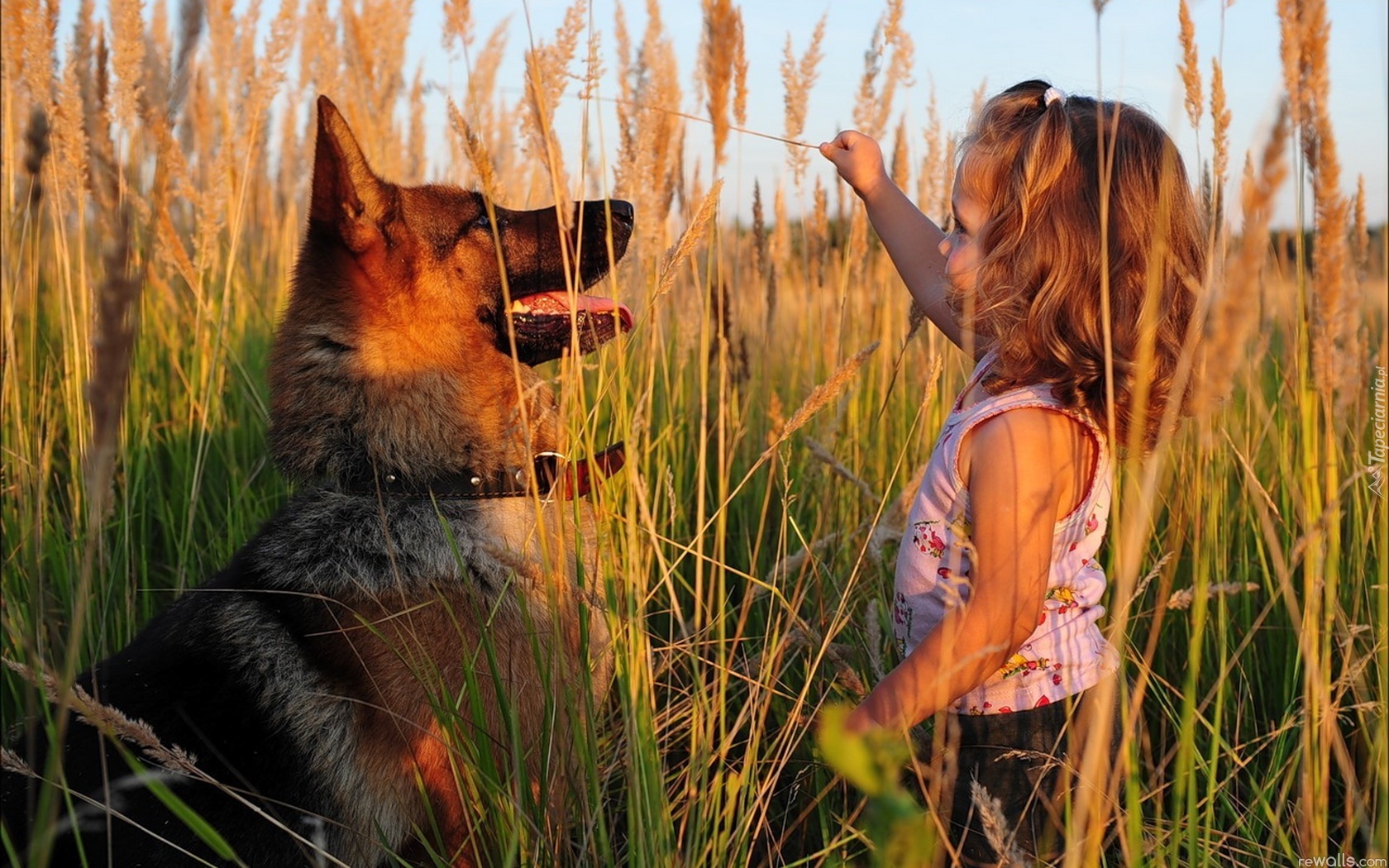 Edytor tapety: Dziewczynka, Trawy, Pies, Zabawa