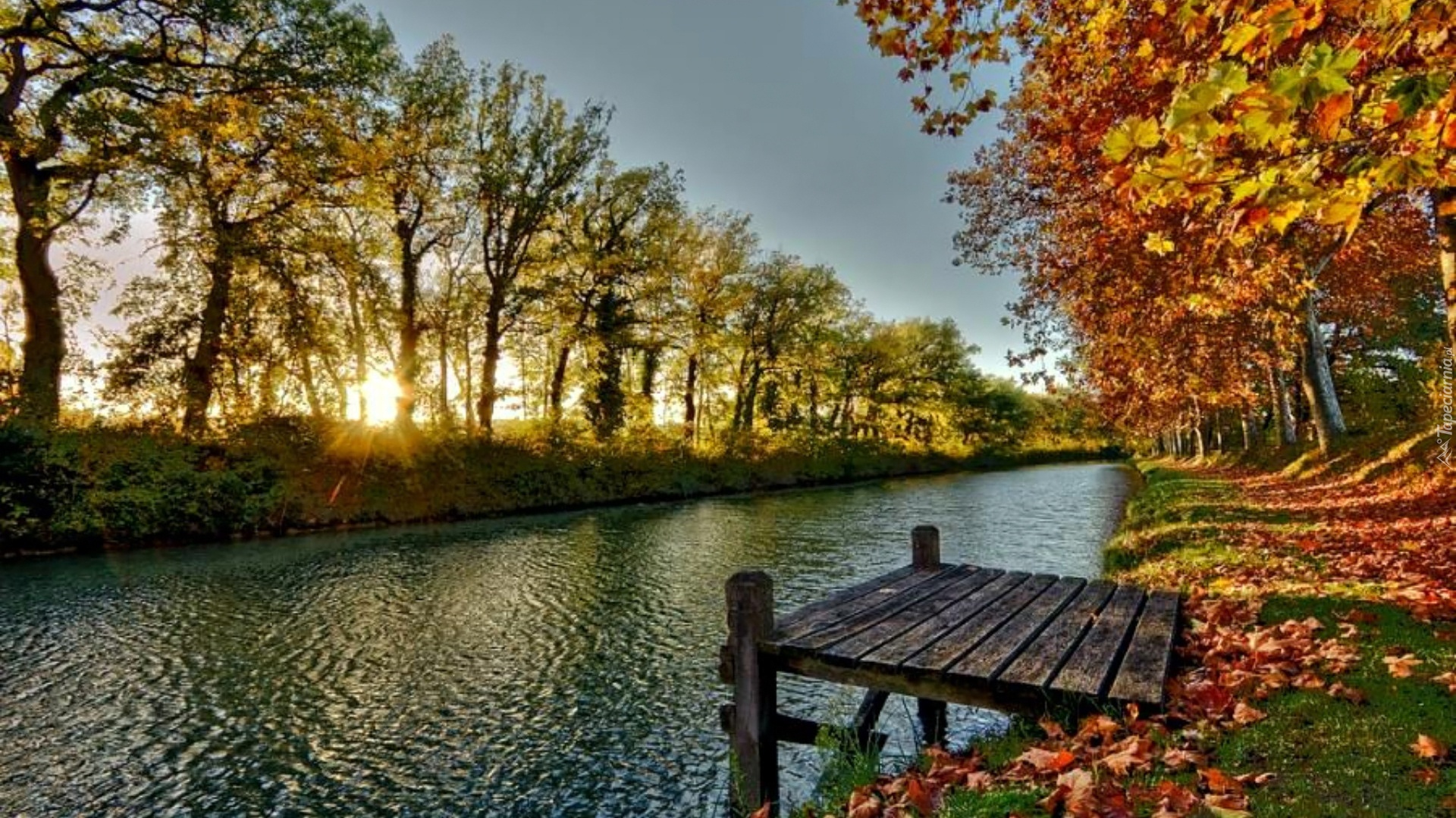 Edytor tapety: Rzeczka, Pomost, Przebijające, Słońce, Drzewa, Liście